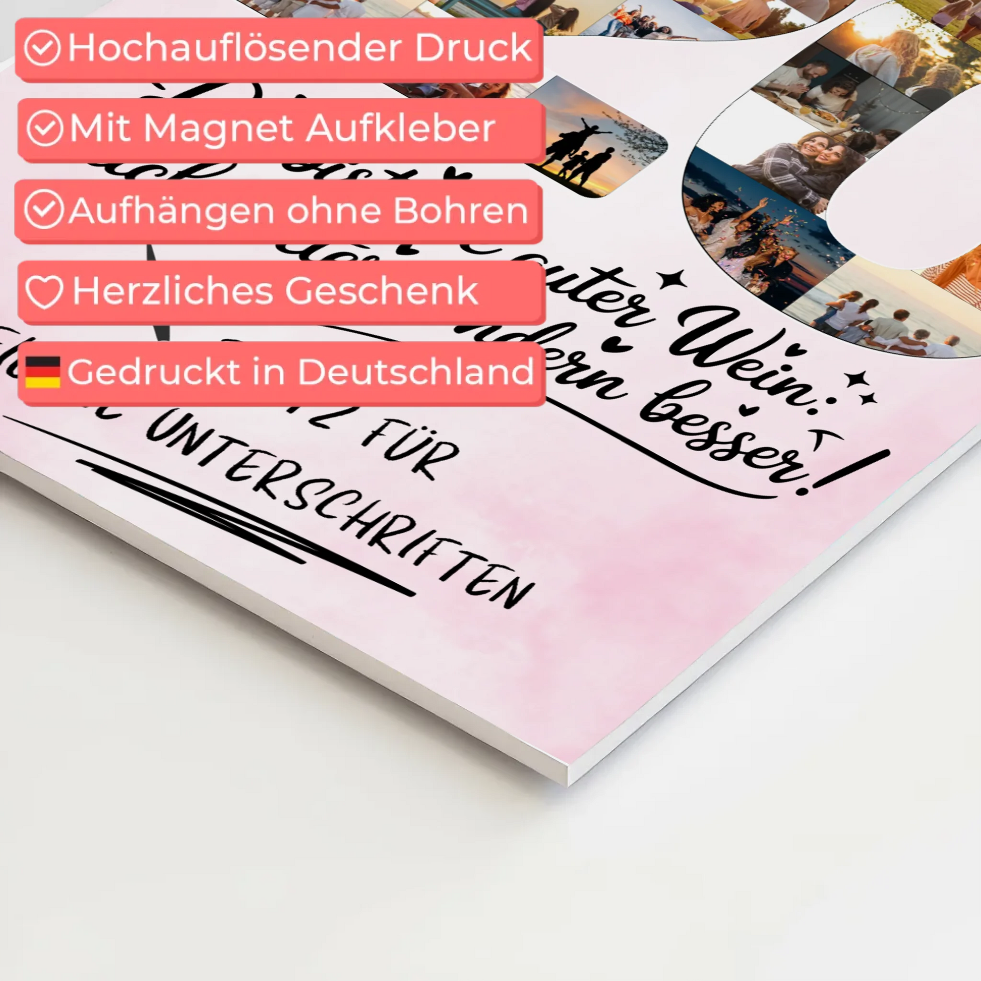 Wähle deinen eigenen Spruch oder Wunschtext, füge Namen und eigene Unterschriften hinzu und wähle ein Hintergrundbild, das perfekt zur beschenkten Person passt. Das Designs schmückt der wunderschöne Spruch 'Nicht älter Besser', der die Stimmung zum Feiern perfekt einfängt. Unser Fotoboard Magnet Poster ist nicht nur ein echter Blickfang, sondern bietet auch viele Personalisierungs-Optionen, um das Geschenk noch individueller zu gestalten.