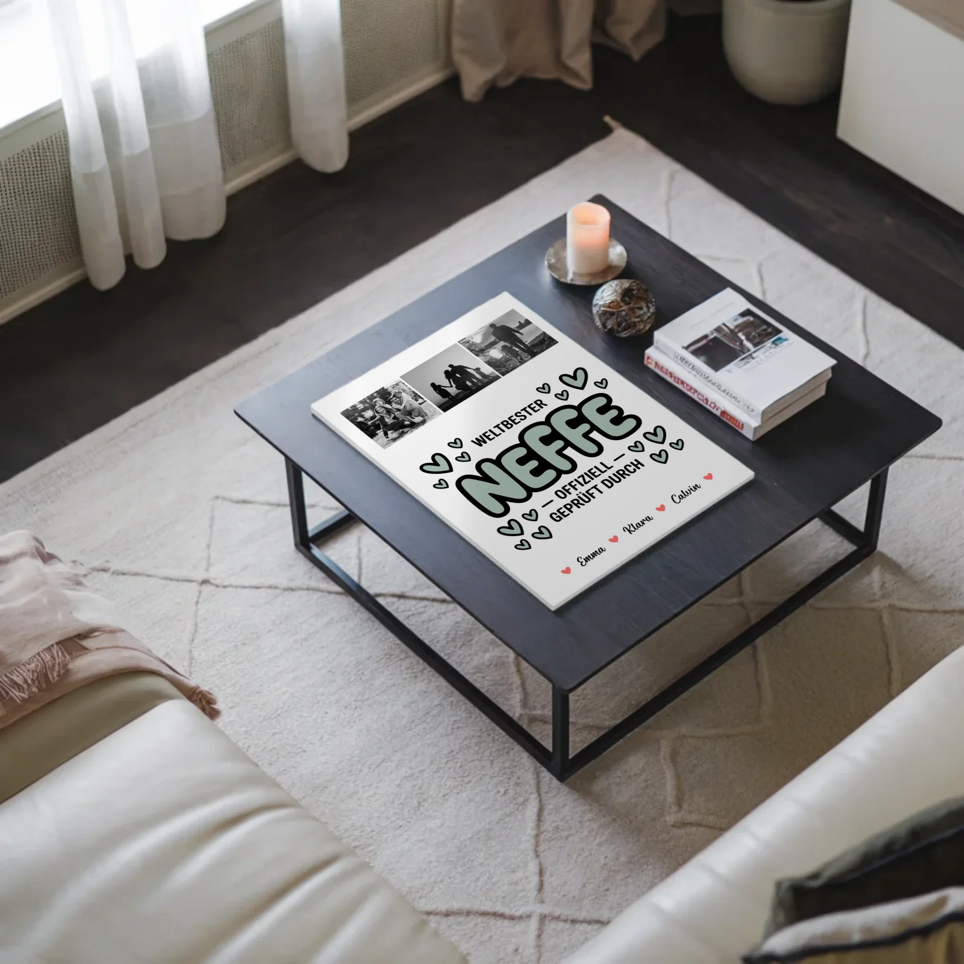 Das Design besticht durch eine kreative Fotocollage mit 3 Fotos, die du entweder farbig oder in Schwarz-Weiß-Optik gestalten kannst. Der Hintergrund lässt sich ganz nach deinem Wunsch wählen: Weiß, florale Muster, Wasserfarb-Style, Holz-Optik oder mit dekorativen Mustern wie Sterne oder Blüten. Das Design wird durch den Spruch Weltbester Neffe Offiziell Geprüft Durch abgerundet, der deinem Neffen zeigt, wie besonders er ist. Dieses Fotocollage für Neffe ist nicht nur ein Blickfang, sondern auch ein persönliches Highlight an der Wand.