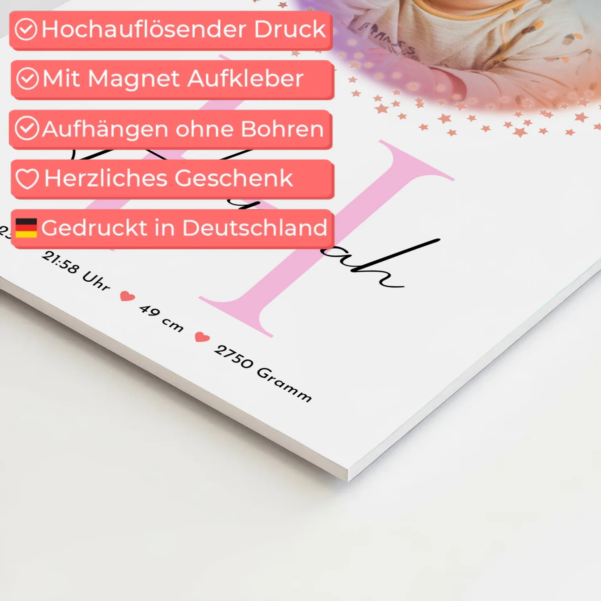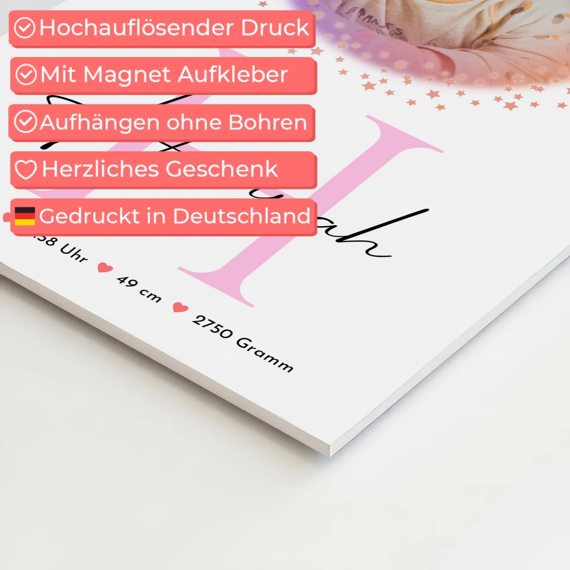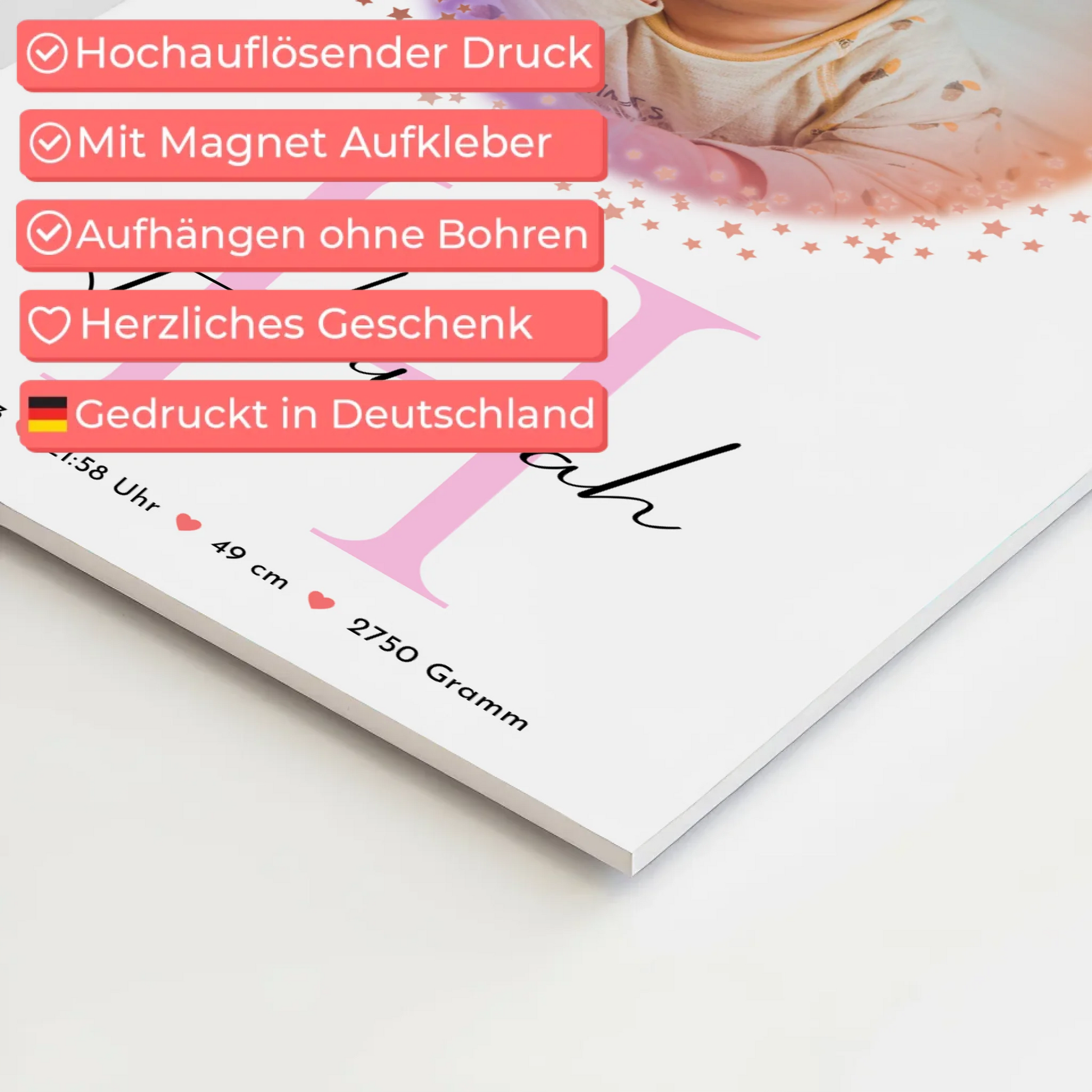 Du kannst folgende Details individuell gestalten: Geburtsdaten wie Gewicht, Größe, Uhrzeit und Datum, 1 Foto, Initial Buchstabe & Name.