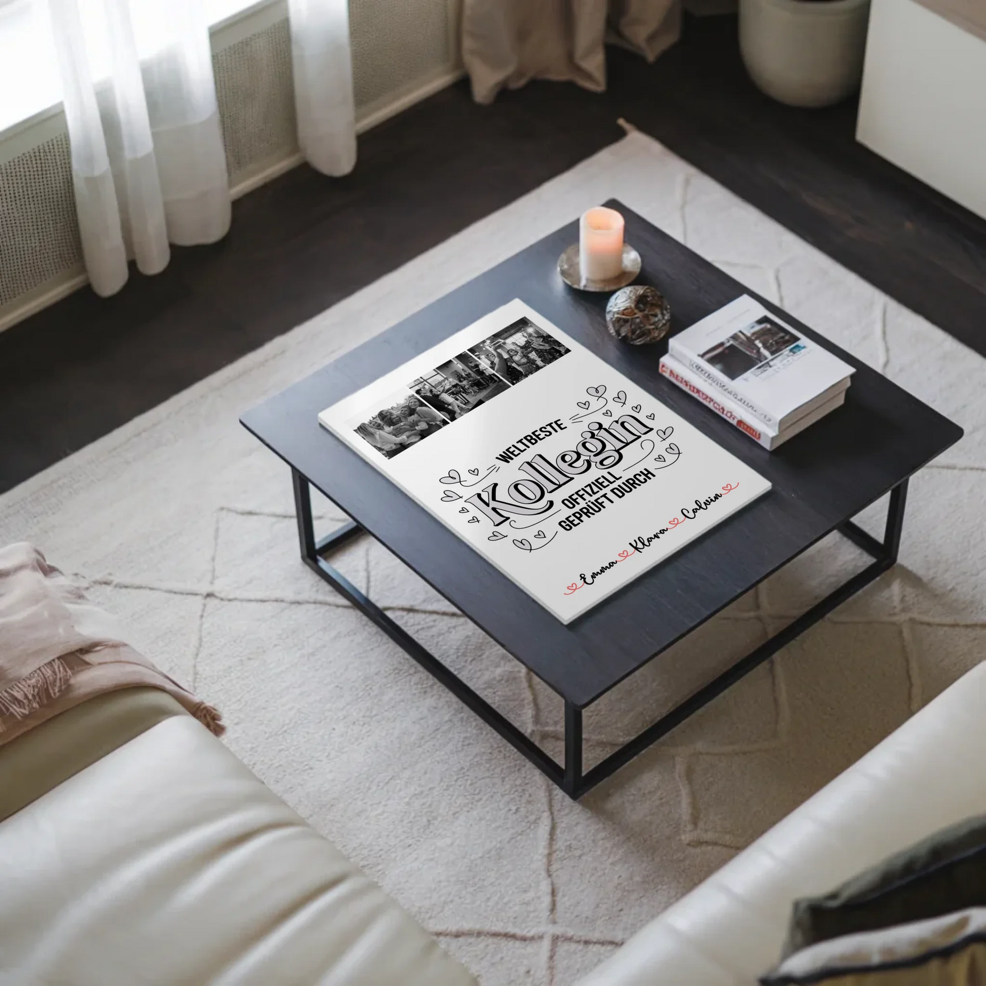 Das Design besticht durch eine ansprechende Fotocollage mit 3 Fotos, die du entweder farbig oder in Schwarz-Weiß-Optik wählen kannst. Der Hintergrund lässt sich nach deinen Wünschen anpassen: Du kannst ihn weiß lassen oder mit floralen Mustern, Wasserfarben-Style, Holz-Optik oder mit Mustern wie Sternen oder Blüten gestalten. Auf dem Design befindet sich der schöne Spruch: WELTBESTE Kollegin OFFIZIELL GEPRÜFT DURCH, der deine Wertschätzung perfekt zum Ausdruck bringt.