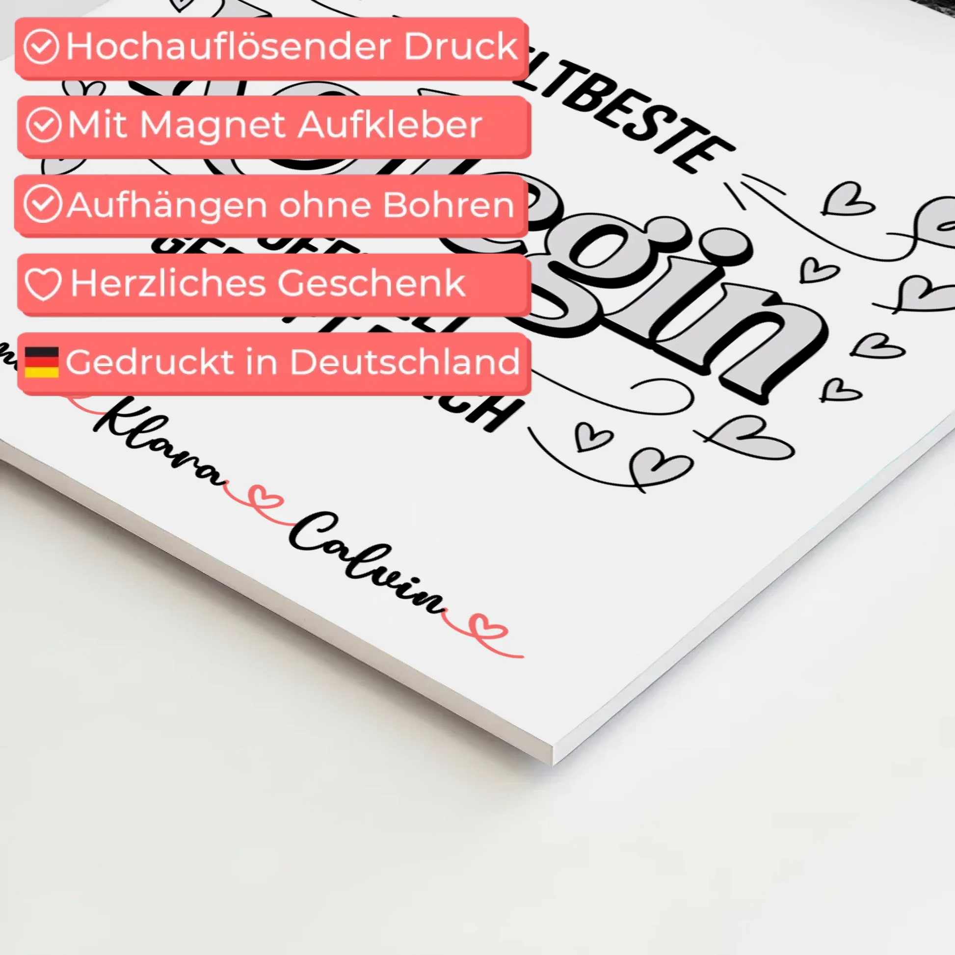 Dieses personalisierte Wandbild ist ein tolles Geschenk für deine Kollegin, um ihr für die Zusammenarbeit zu danken oder sie bei der Verabschiedung zu ehren. Es ist nicht nur ein dekoratives Element, sondern auch eine bleibende Erinnerung an gemeinsame Momente. Überrasche deine Kollegin mit diesem individuellen Geschenk, das ihre Einzigartigkeit unterstreicht und sie für immer an eure gemeinsame Zeit erinnert.