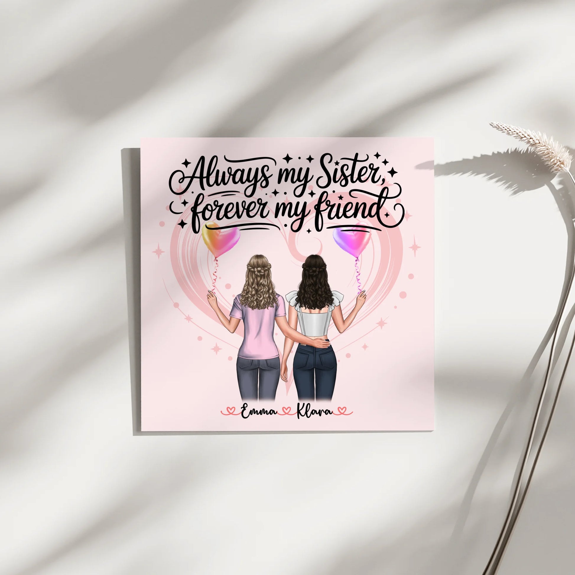Du kannst 2 Clipart Frauen, Namen, den Hintergrund und einen eigenen Spruch oder Wunschtext personalisieren. Als schöner Standardspruch steht Always my sister, forever my friend bereit, du kannst ihn aber ändern oder durch einen eigenen Wunschtext ersetzen.