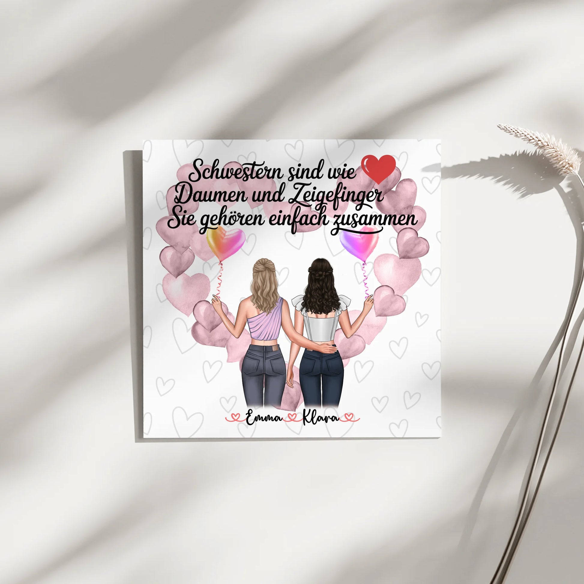 Auf dem Design steht der schöne Spruch Schwestern sind wie Daumen und Zeigefinger - sie gehören einfach zusammen. Du kannst den Spruch ändern und aus über 100 verschiedenen Sprüchen wählen oder deinen eigenen Wunschtext schreiben.