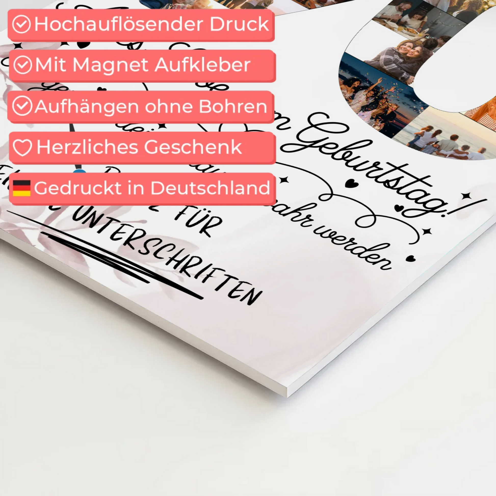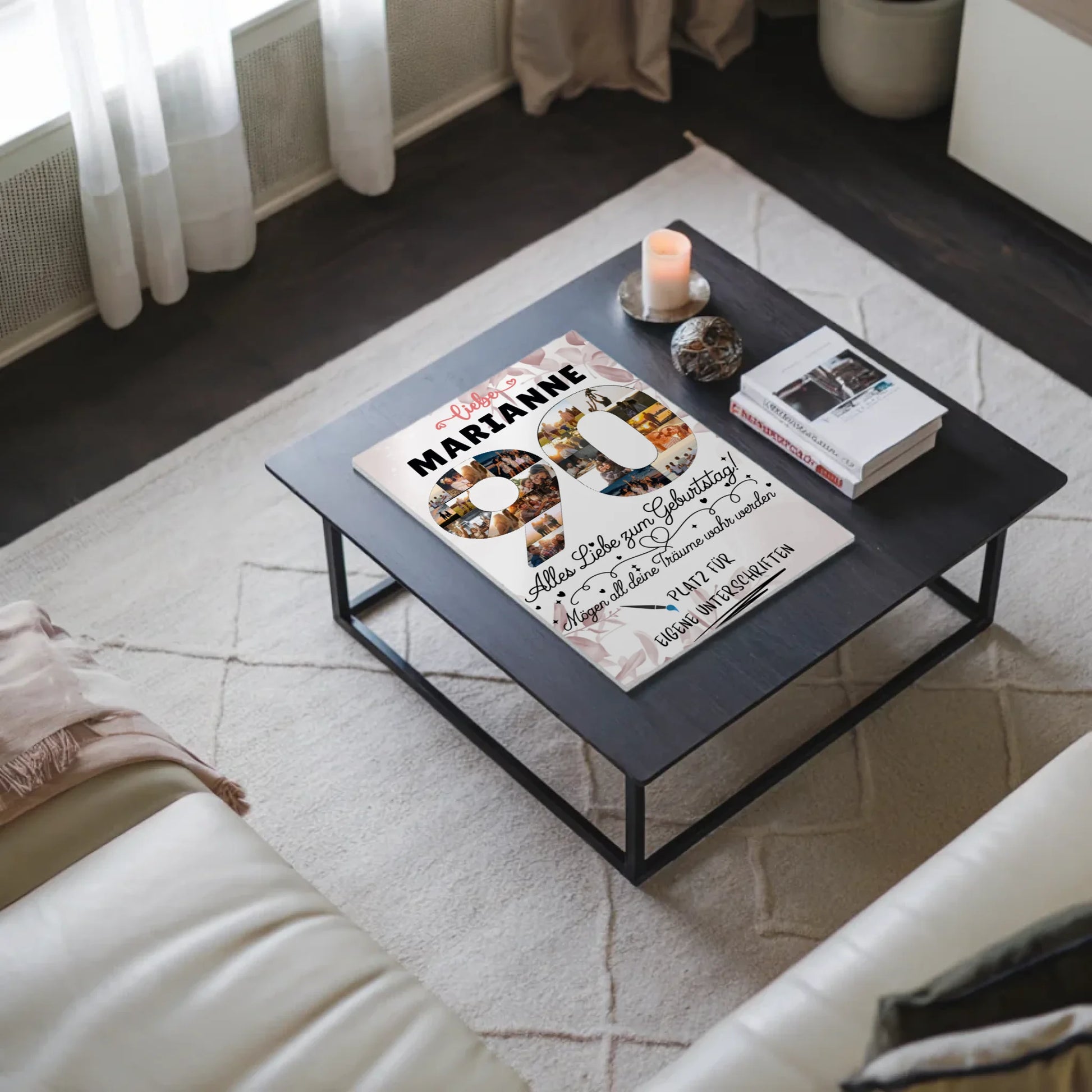 Überrasche Deine Lieben mit einem einzigartigen und personalisierten Fotoboard Poster magnetisch mit Wunschtext zum 90. Geburtstag! Dieses individuell gestaltbare Geschenk ist nicht nur ein wunderschöner Blickfang, sondern auch eine wunderbare Erinnerung an unvergessliche Momente. Du kannst über 20+ Fotos auswählen, einen eigenen Spruch oder Wunschtext hinzufügen sowie Namen oder eigene Unterschriften einfügen.