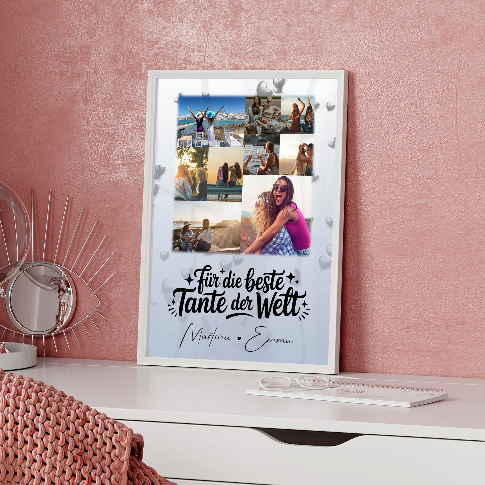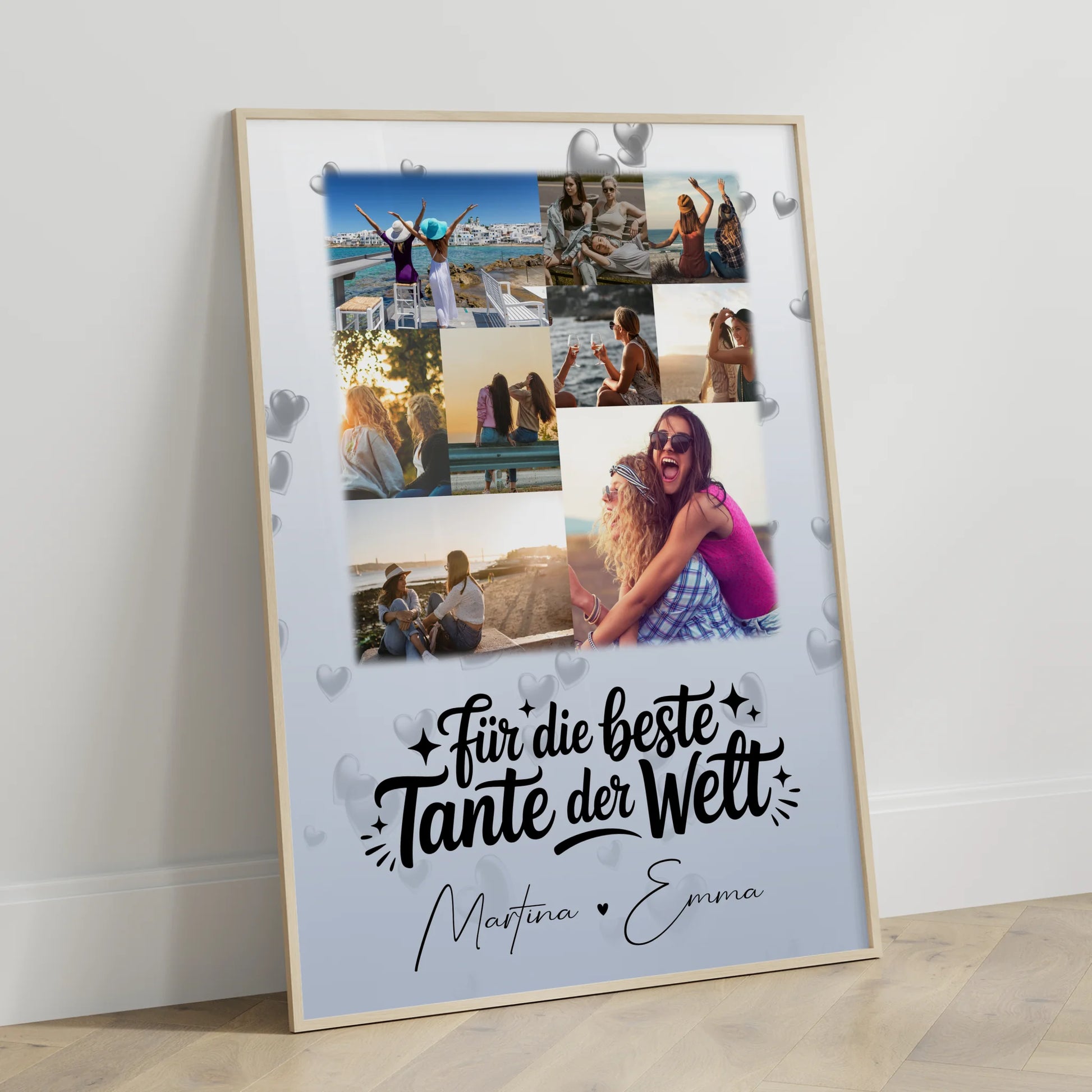 Überrasche deine liebe Tante mit einem einzigartigen Geschenk, das ihre besonderen Momente perfekt in Szene setzt. Unsere Fotocollage Großes Bild Aus Vielen Kleinen 9 Fotos Für Die Beste Tante Der Welt ist das ideale personalisierte Geschenk, um deine Wertschätzung zu zeigen. Du kannst diese kreative Fotocollage ganz individuell gestalten, indem du 9 Fotos auswählst, einen eigener Spruch oder Wunschtext hinzufügst und Namen eingibst. Das Design ist mit dem schönen Spruch „Für die beste Tante der Welt“ versehen und macht dieses Geschenk zu etwas ganz Besonderem. Perfekt geeignet für Fotocollage für Tante und für jeden Anlass, sei es Geburtstag, Weihnachten, oder einfach nur so, um deiner Tante eine Freude zu bereiten. Zeige deiner Tante, wie viel sie dir bedeutet, mit diesem liebevoll personalisierten Geschenk, das garantiert für strahlende Augen sorgt.