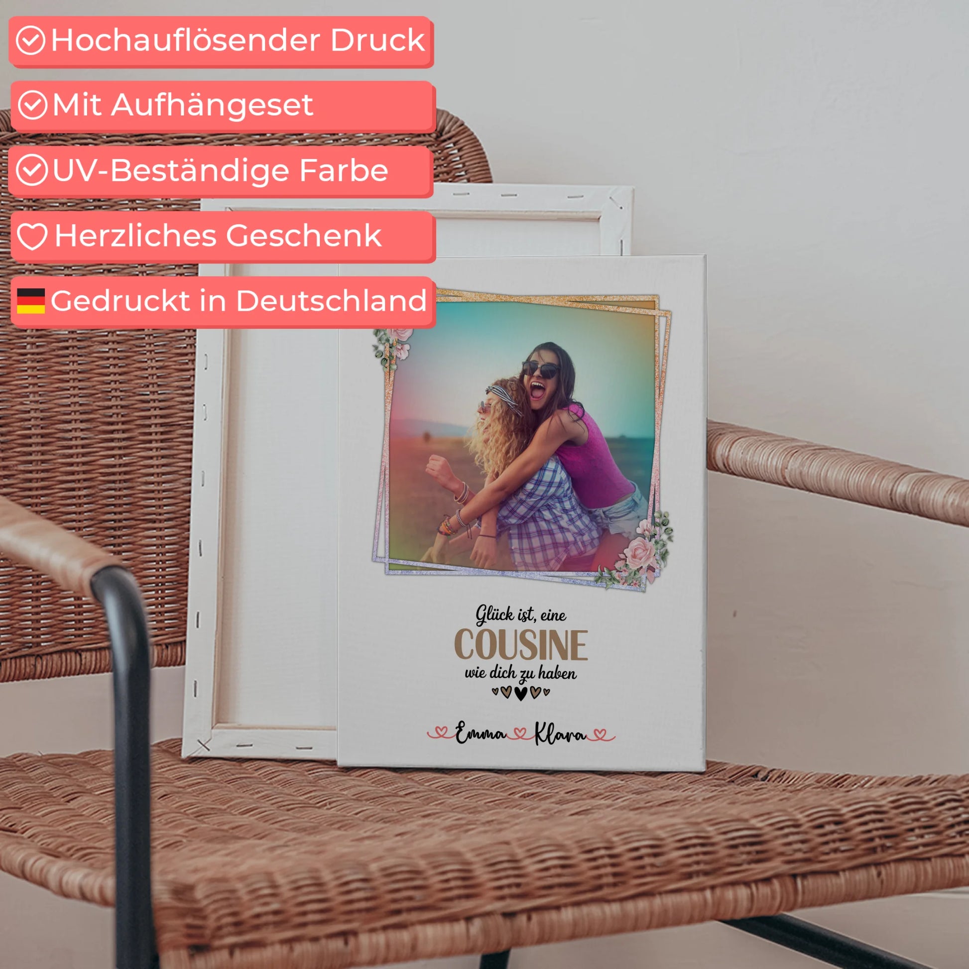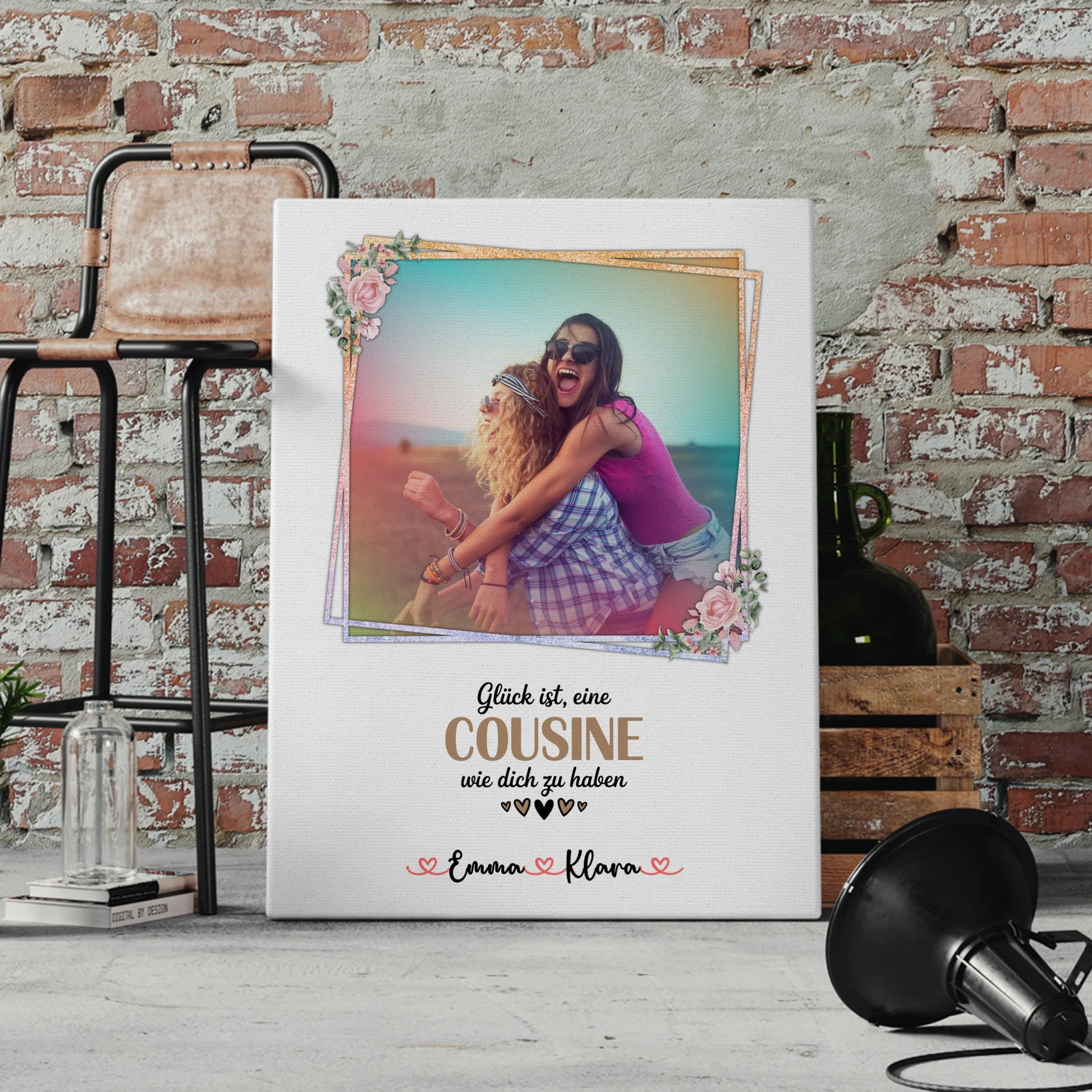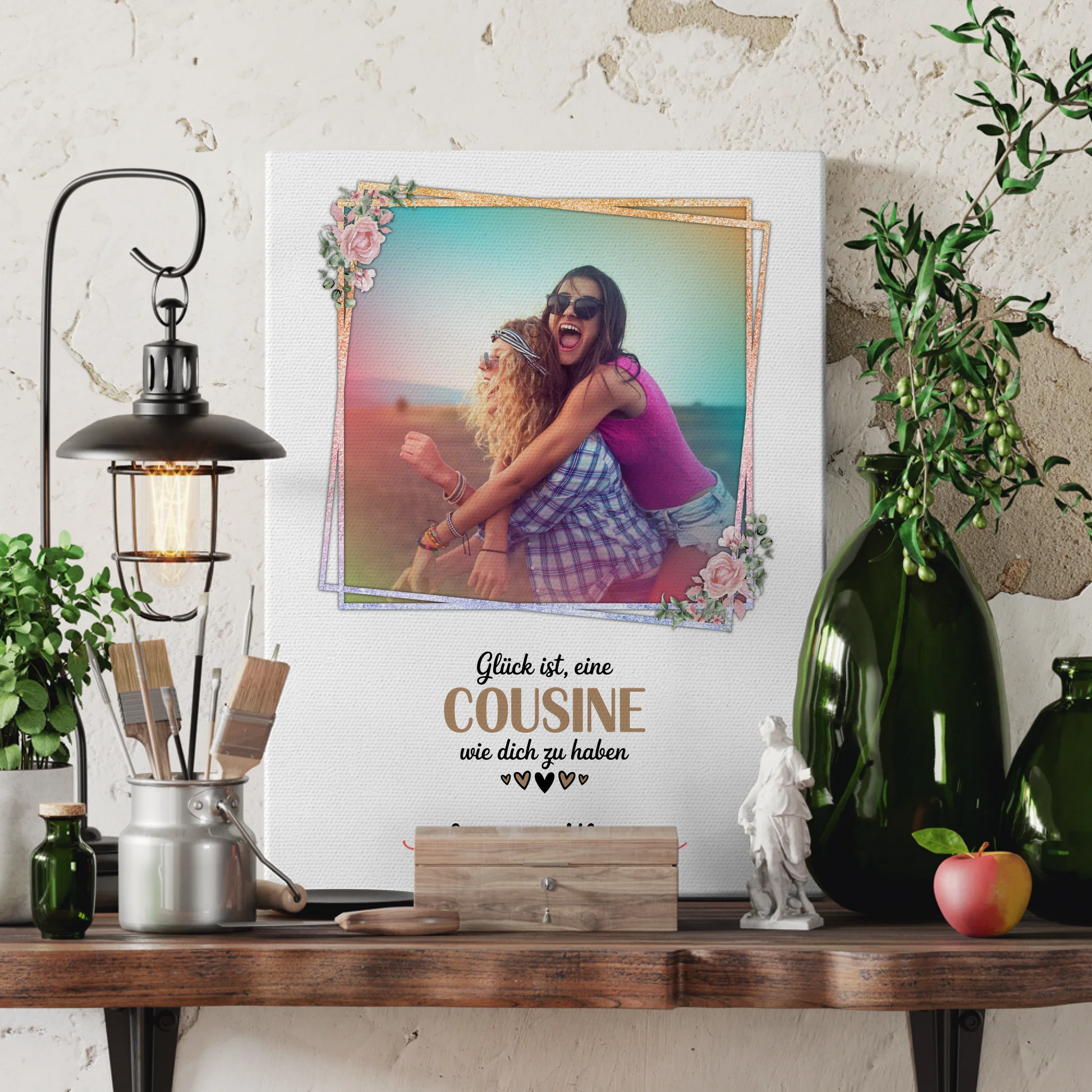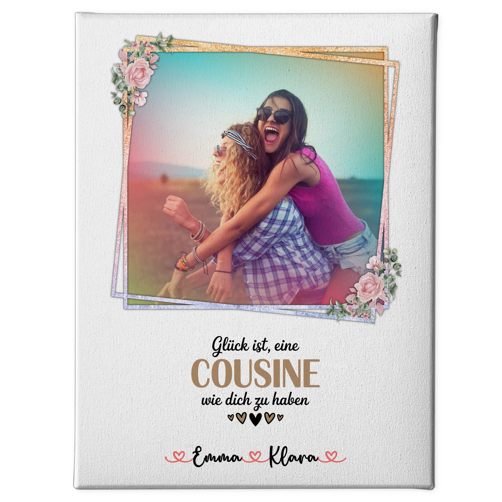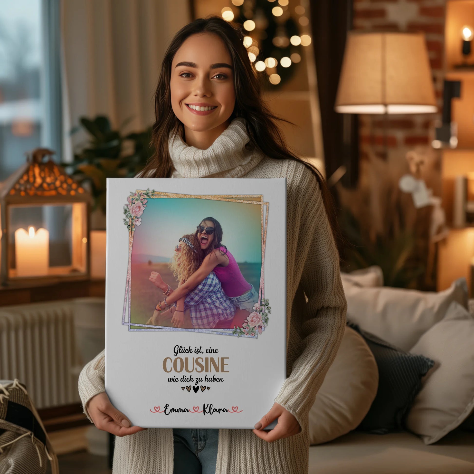 Gestalte jetzt Deine Fotocollage für Deine Cousine und füge Foto, Namen und Wunschtext hinzu, um ein unvergessliches Geschenk zu erstellen.