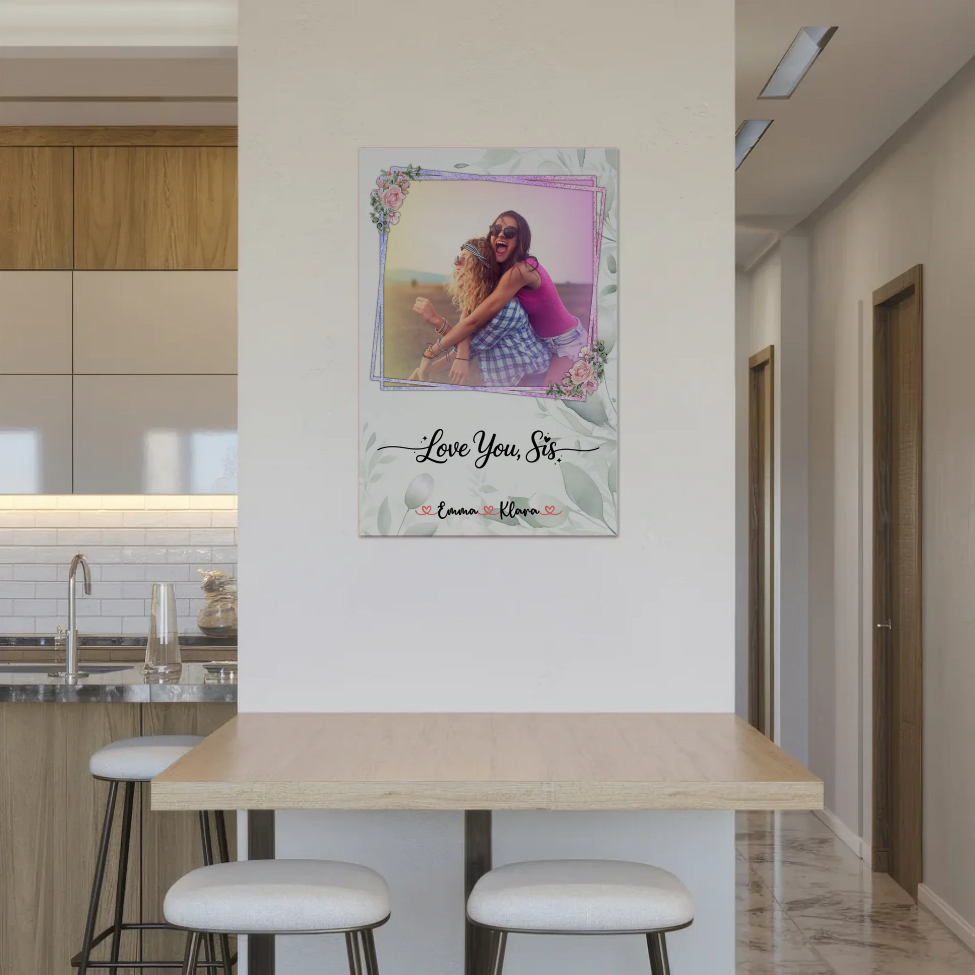 Überrasche deine Schwester zum Geburtstag mit dieser emotionalen Fotocollage, die viele kleine Erinnerungsbilder zu einem großen Kunstwerk verbindet und den liebevollen Spruch Love you, sis trägt; ideal für besondere Momente und als persönliche Geschenkidee für die Schwester.