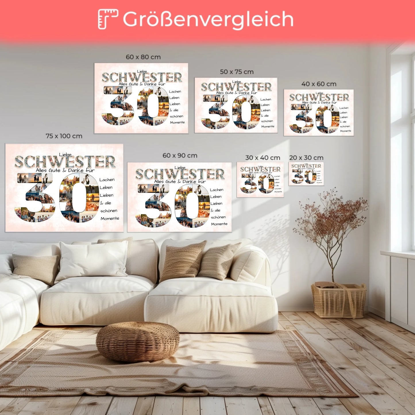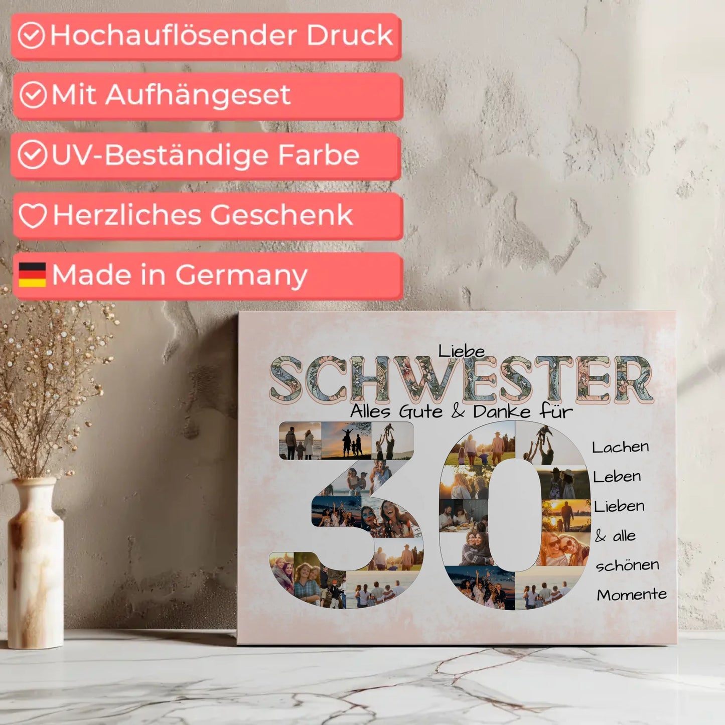 Du möchtest mal wieder etwas einzigartiges verschenken? Unsere Fotocollage Leinwand zum 30 Geburtstag für Schwester Alles Gute ein wunderschönes personalisiertes Geschenk.