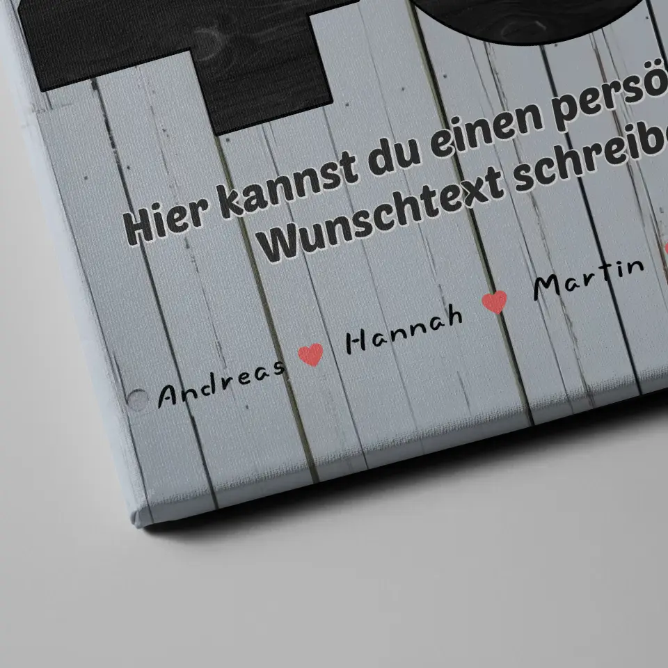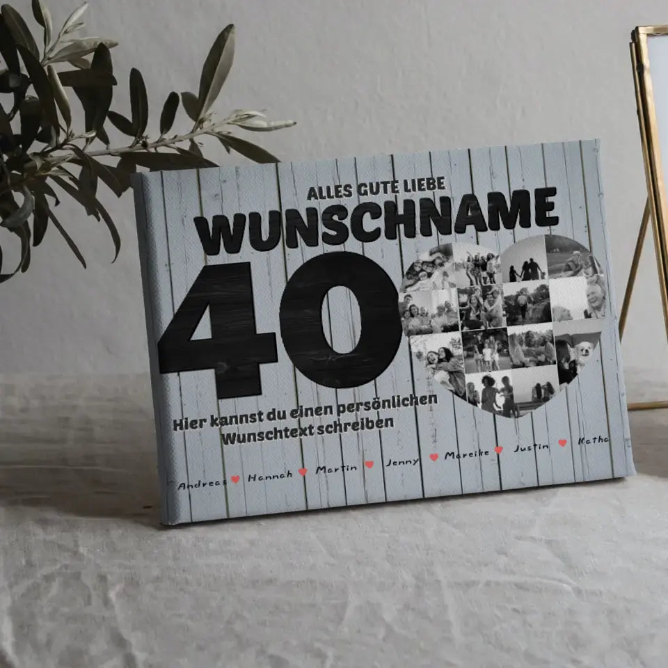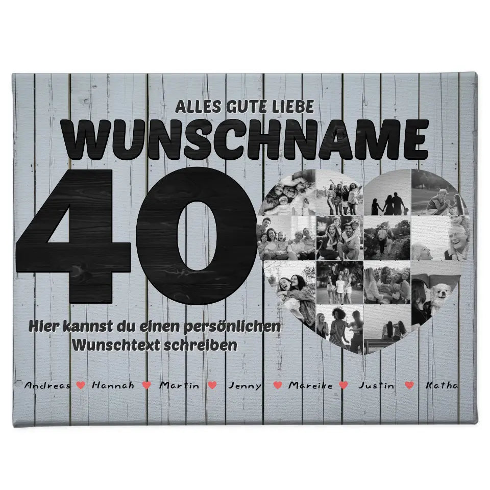 Du kannst bei diesem schönen Design 15 Namen, 14 Fotos, Hintergrundbild & Wunschtext ganz individuell personalisieren.