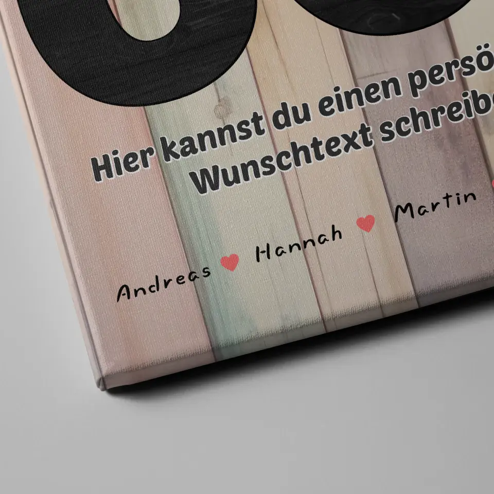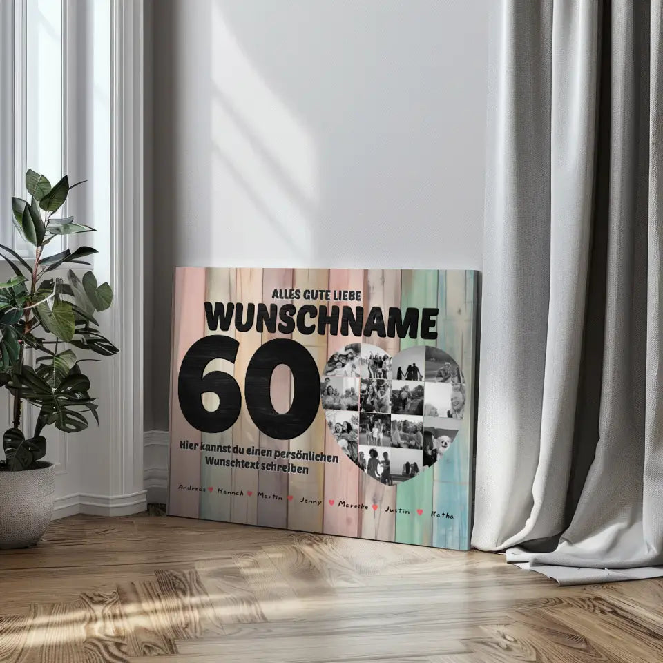 Du kannst bei diesem schönen Design 15 Namen, 14 Fotos, Hintergrundbild & Wunschtext ganz individuell personalisieren.