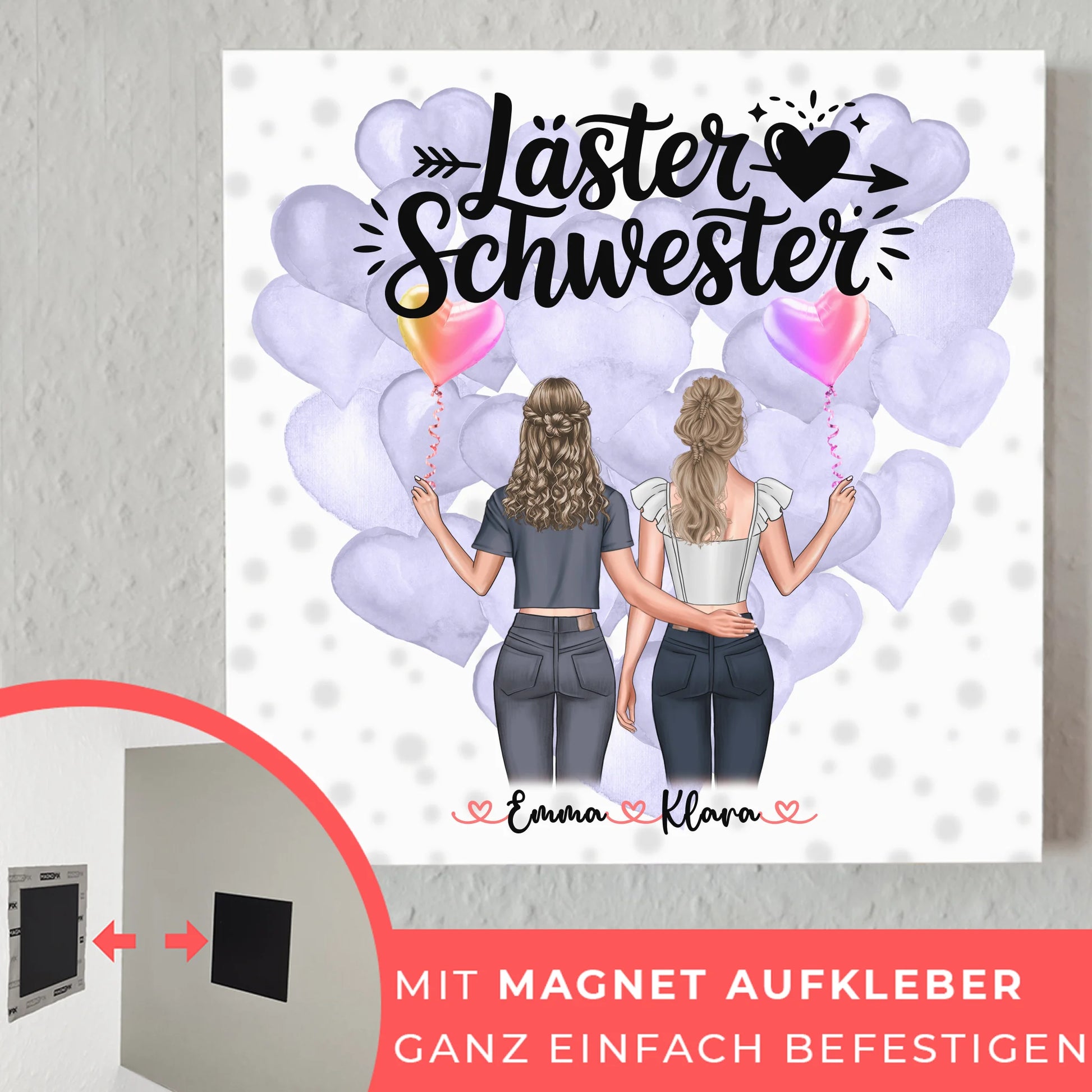 Du kannst 2 Clipart Frauen auswählen und anpassen, die Namen hinzufügen, das Hintergrundbild wechseln und einen eigenen Spruch oder Wunschtext eingeben. Auf dem Design ist aktuell der schöne Spruch Läster Schwester, den du jederzeit anpassen oder durch einen anderen Text ersetzen kannst.