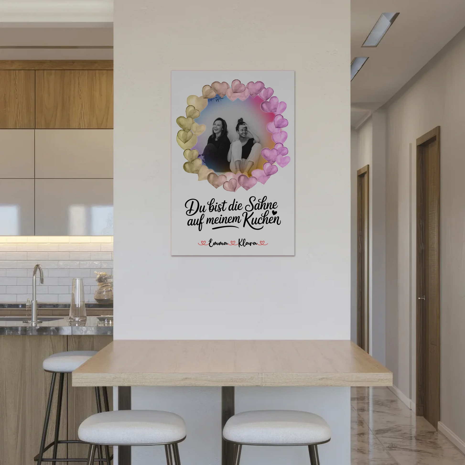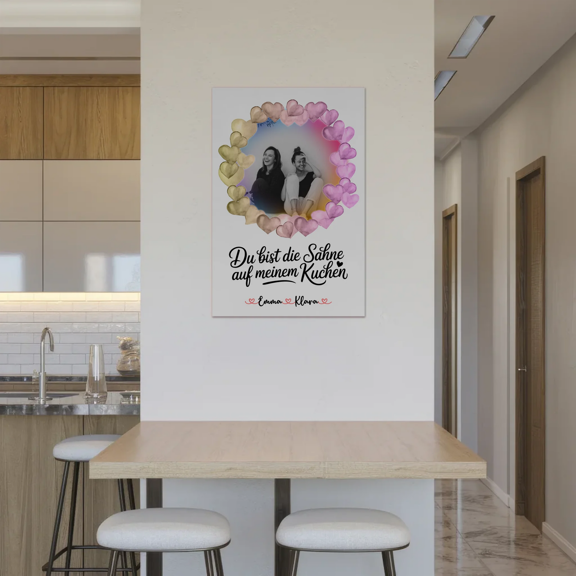 Persönliches Fotogeschenk für deine beste Freundin zum Geburtstag das du ganz einfach selbst personalisieren kannst. Lade ein Lieblingsfoto hoch wähle einen passenden Hintergrund trage den Namen ein und formuliere deinen eigenen Wunschtext oder nutze den liebevollen Spruch Du bist die Sahne auf meinem Kuchen. Das Ergebnis ist ein individuelles Erinnerungsstück das Emotionen weckt und lange Freude bereitet.