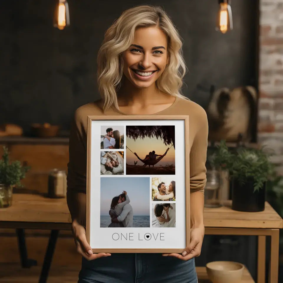 Du magst einzigartige Geschenke? Dann ist unser Fotogeschenk für Freundin Fotocollage One Love Mit Fotos das perfekte personalisierbare Geschenk.