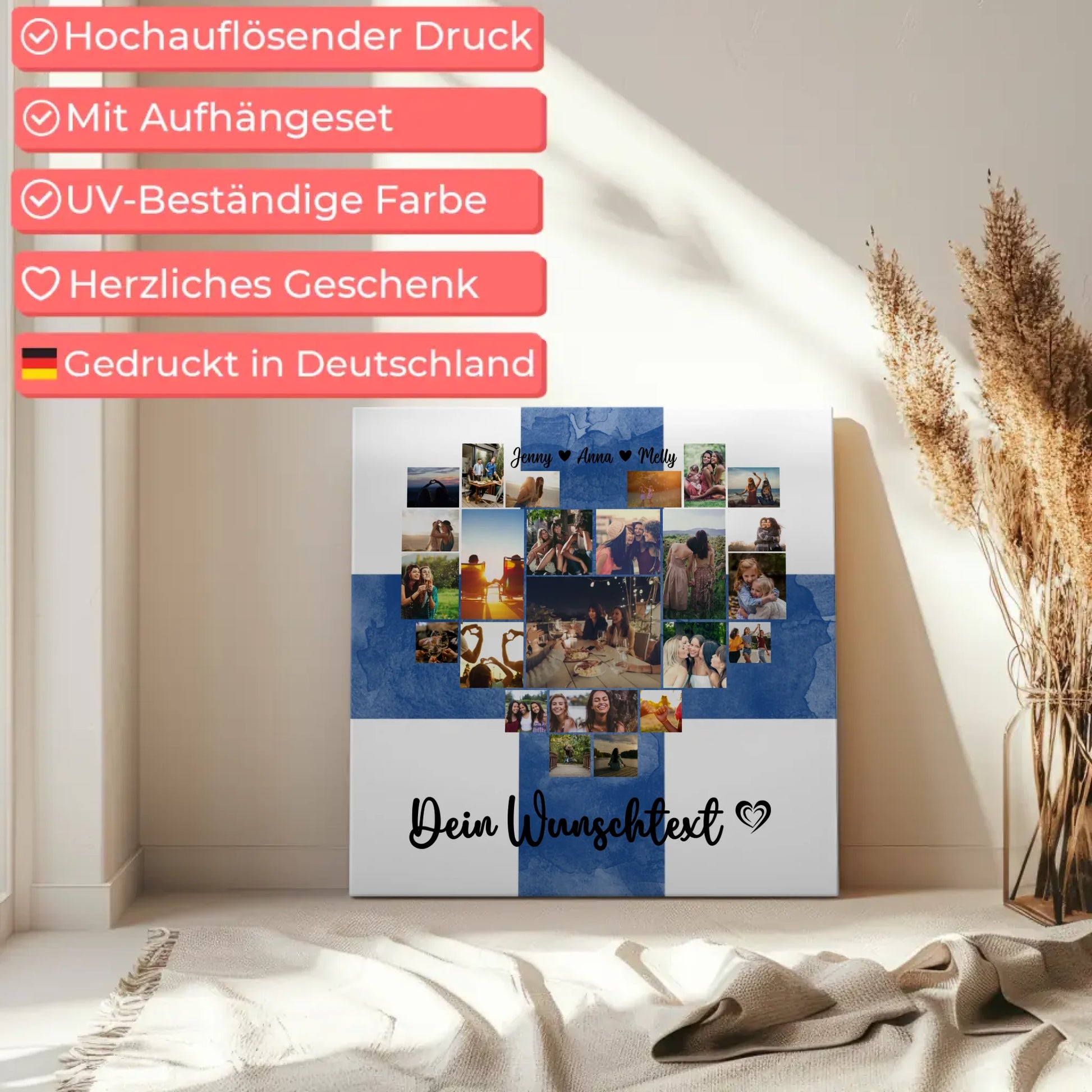 Das perfekte Geschenk für deine beste Freundin aus Finnland: die Fotoleinwand Fotocollage Beste Freundin aus Finnland gestalten. Mit dieser einzigartigen Leinwand Bank kannst du die schönsten gemeinsame Erinnerungen in Form von über 20+ Fotos festhalten. Egal ob beim Urlaub, Reisen oder einfach nur bei gemeinsamen Momenten – diese personalisierte Fotocollage bringt alle wundervollen Erlebnisse zurück und sorgt für ein Lächeln auf ihrem Gesicht.