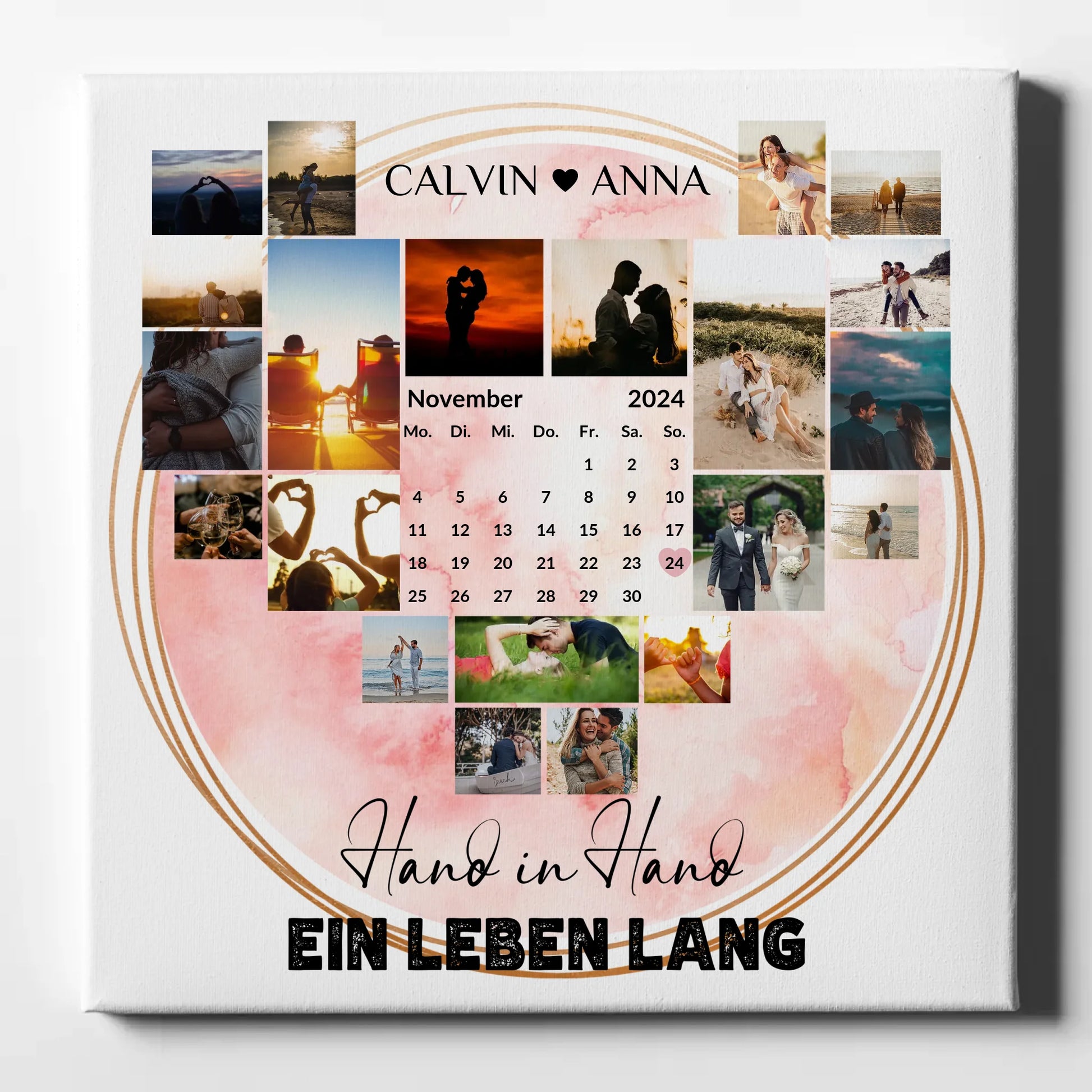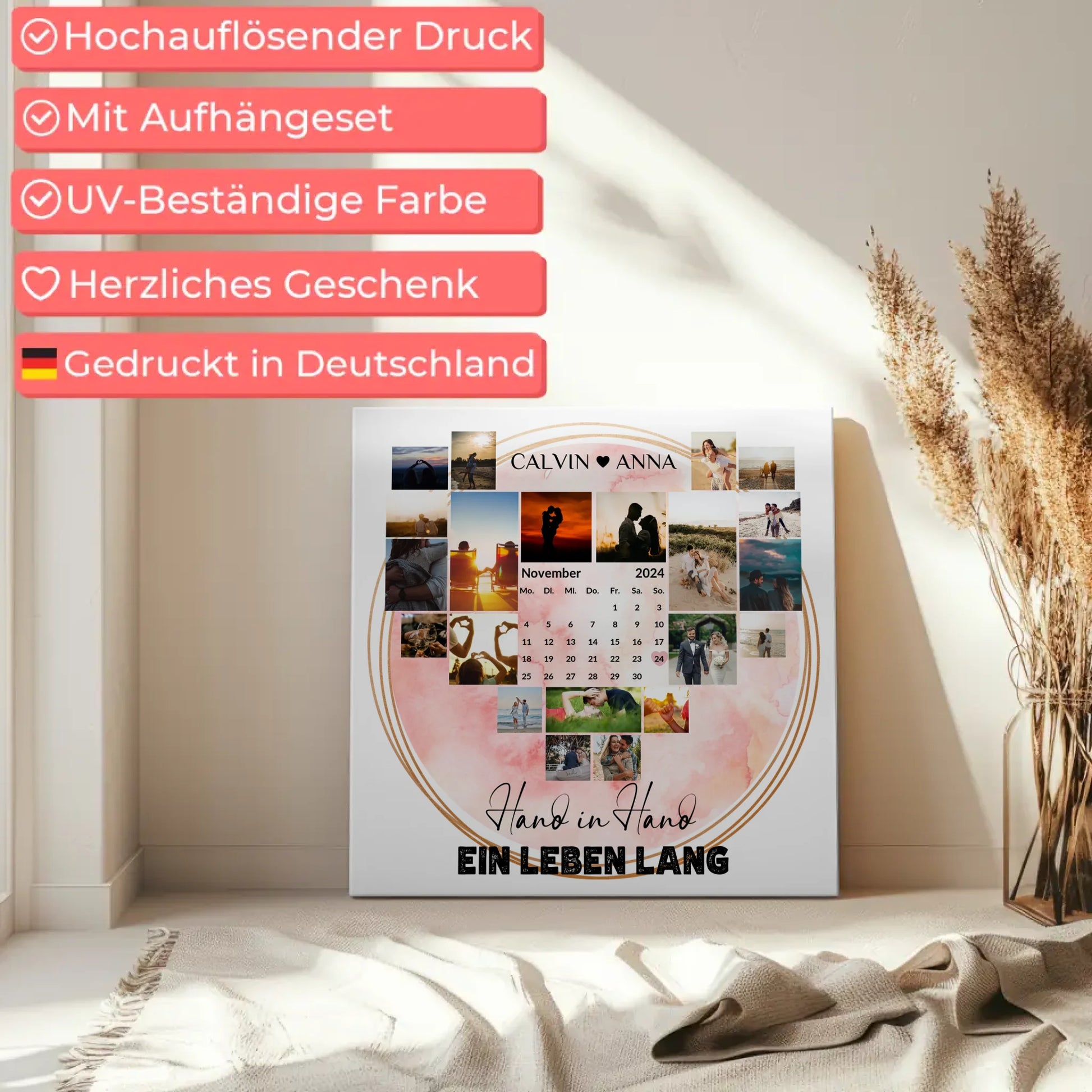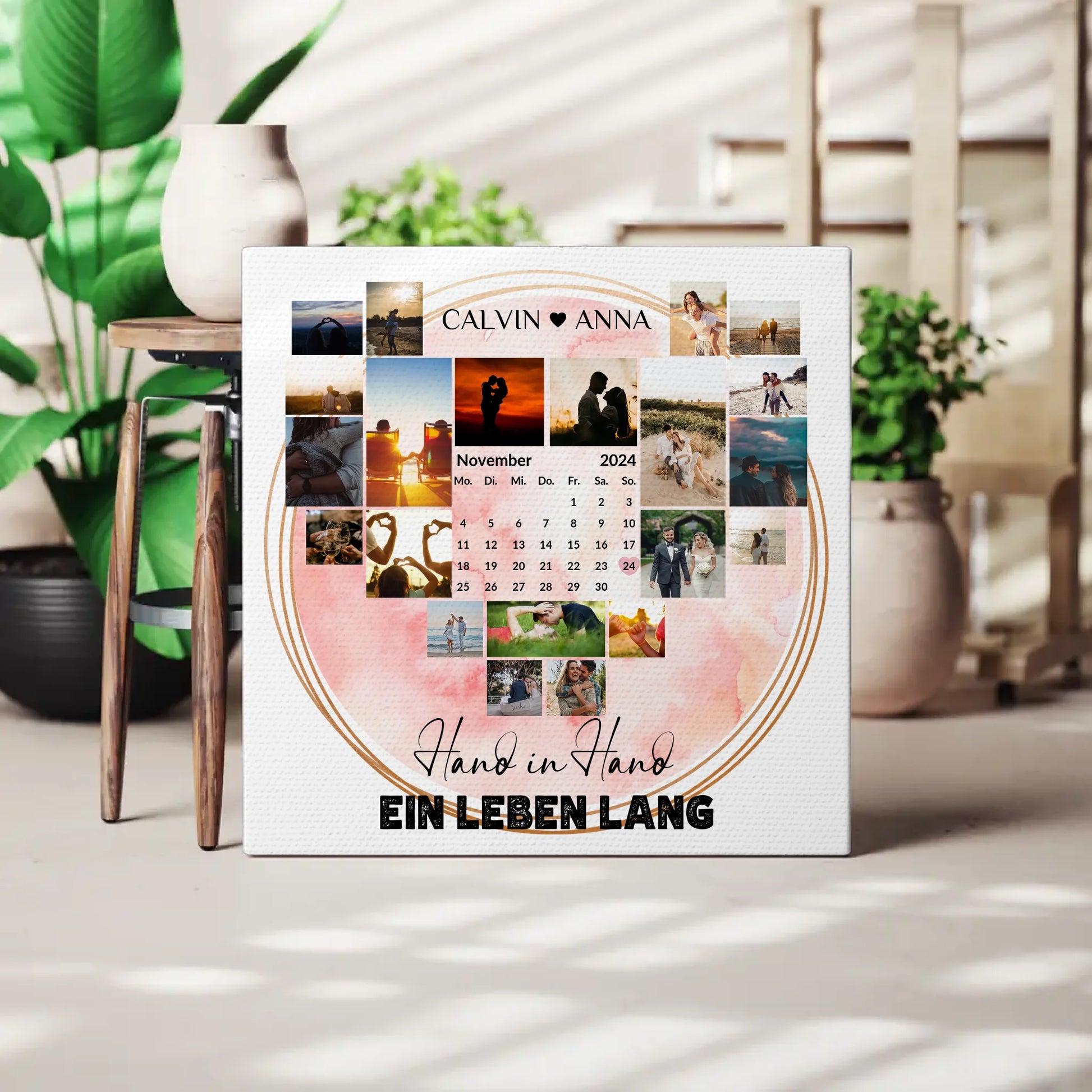 Überrasche deinen Partner mit einer einzigartigen Fotoleinwand Für Paare, die speziell für euch gestaltet ist! Unsere Fotocollage 'Hand In Hand Ein Leben Lang' ist das perfekte personalisierte Geschenk, um eure innige Liebe zu zelebrieren. Du kannst über 20+ Fotos auswählen, die besonderen Momente eurer Beziehung festhalten, sowie eure Namen und ein besonderes Datum hinzufügen.