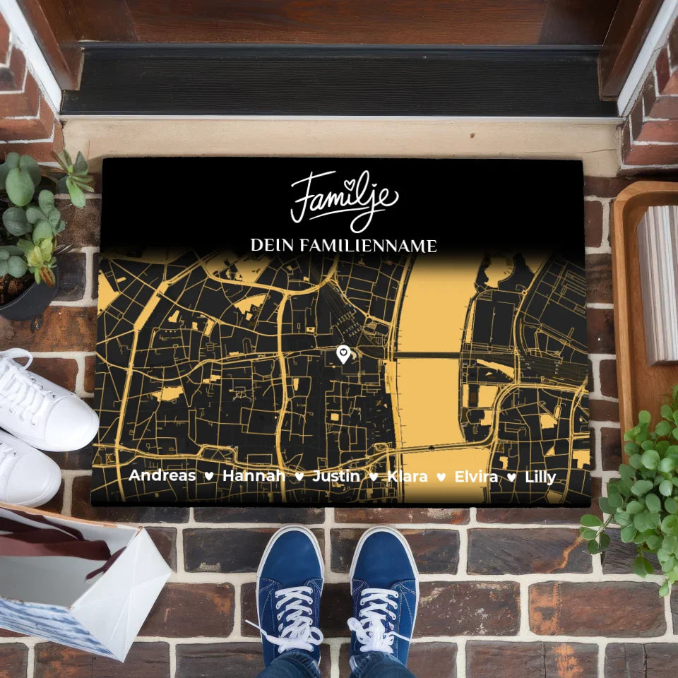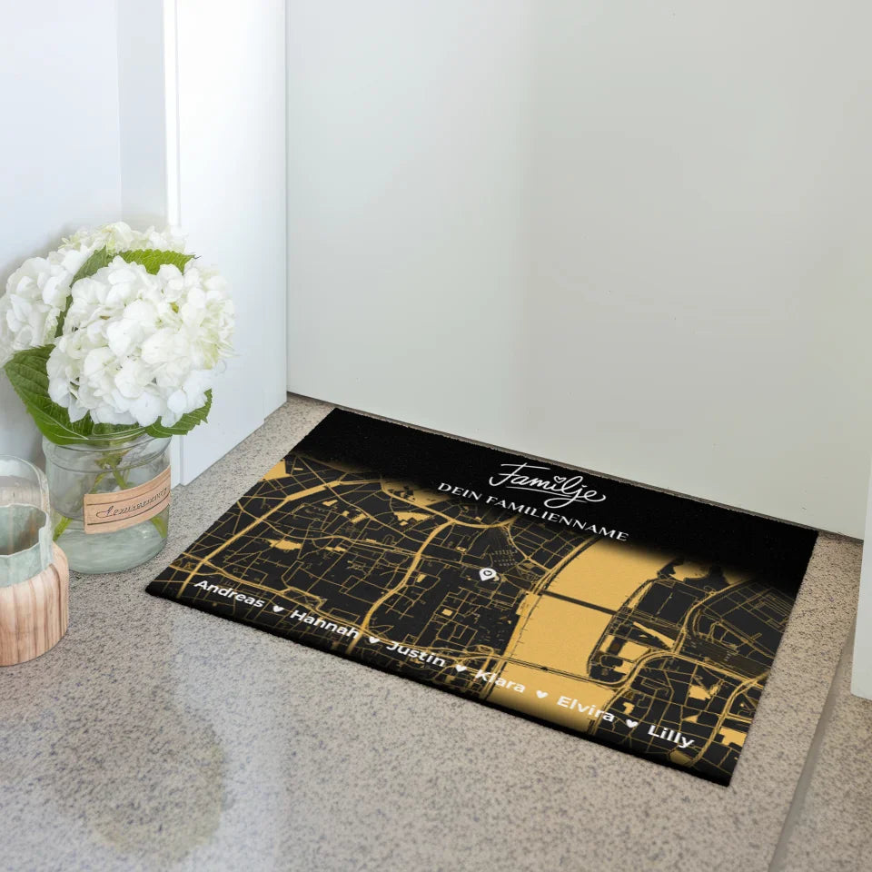 Fußmatte personalisiert Familie Stadt Karte Üdvözöljük Schwarz Gold