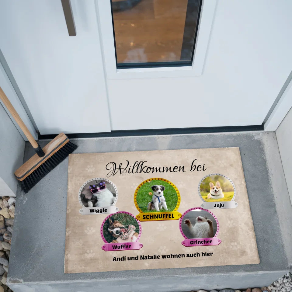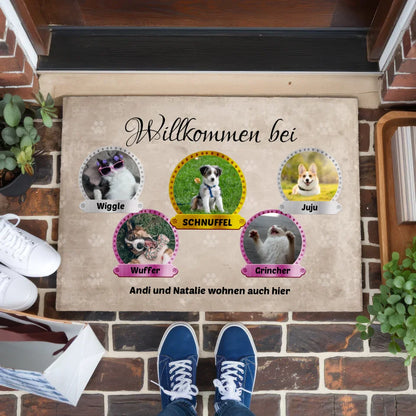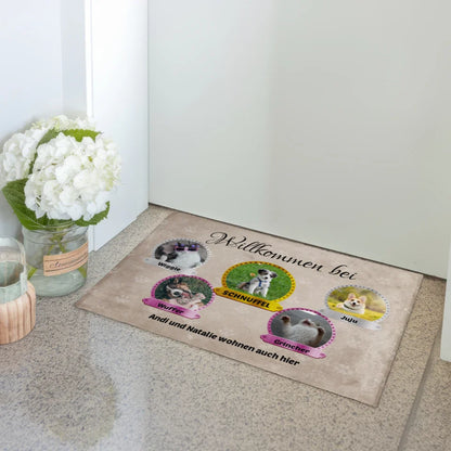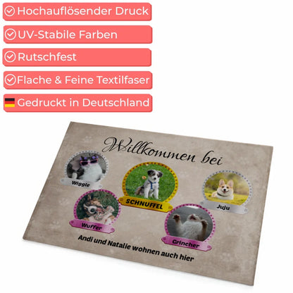 Entdecke unsere einzigartige Fußmatte personalisiert, die mit dem charmanten Spruch 'Willkommen Bei' einladend gestaltet ist. Diese individuelle Fußmatte wird zum absoluten Hingucker vor deiner Tür und heißt jeden Besucher herzlich willkommen. Du kannst Fotos von deinen geliebten Haustieren, die Namen der Tiere, das Hintergrundbild sowie einen eigenen Spruch oder Wunschtext hinzufügen. So gestaltest du eine ganz persönliche Willkommens-Fußmatte, die perfekt zu dir und deiner Familie passt.