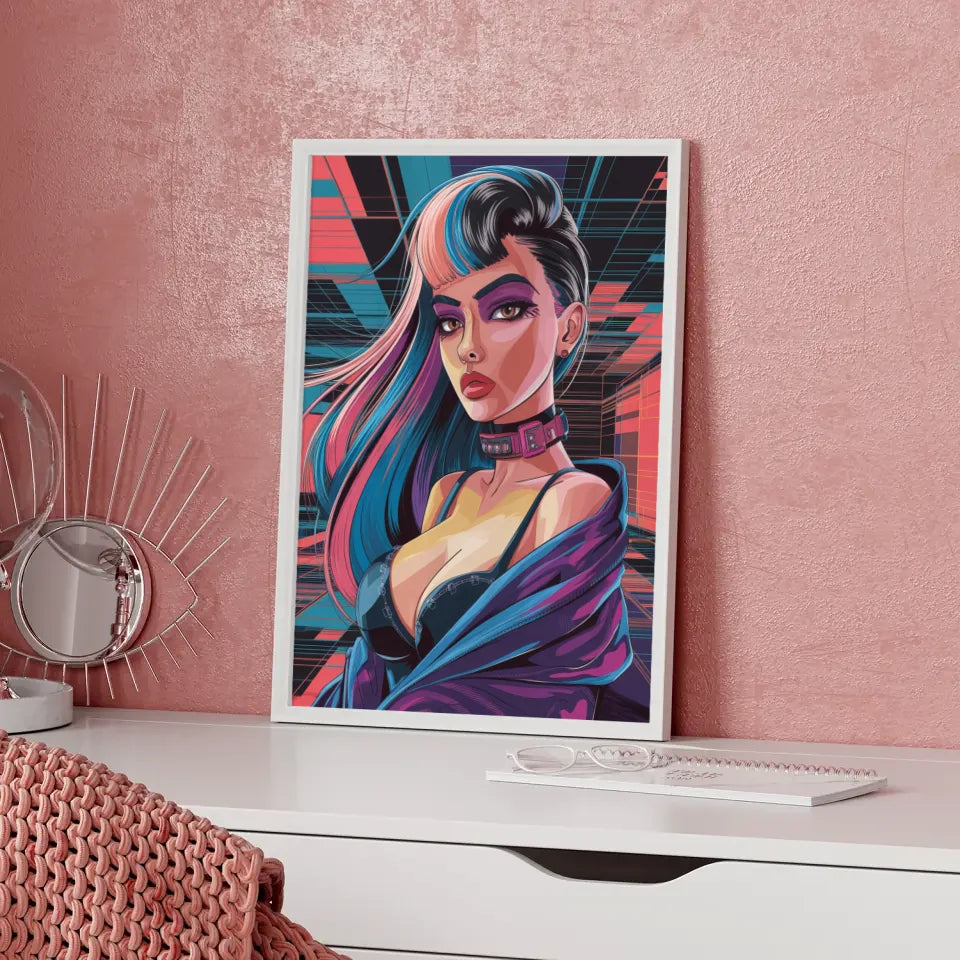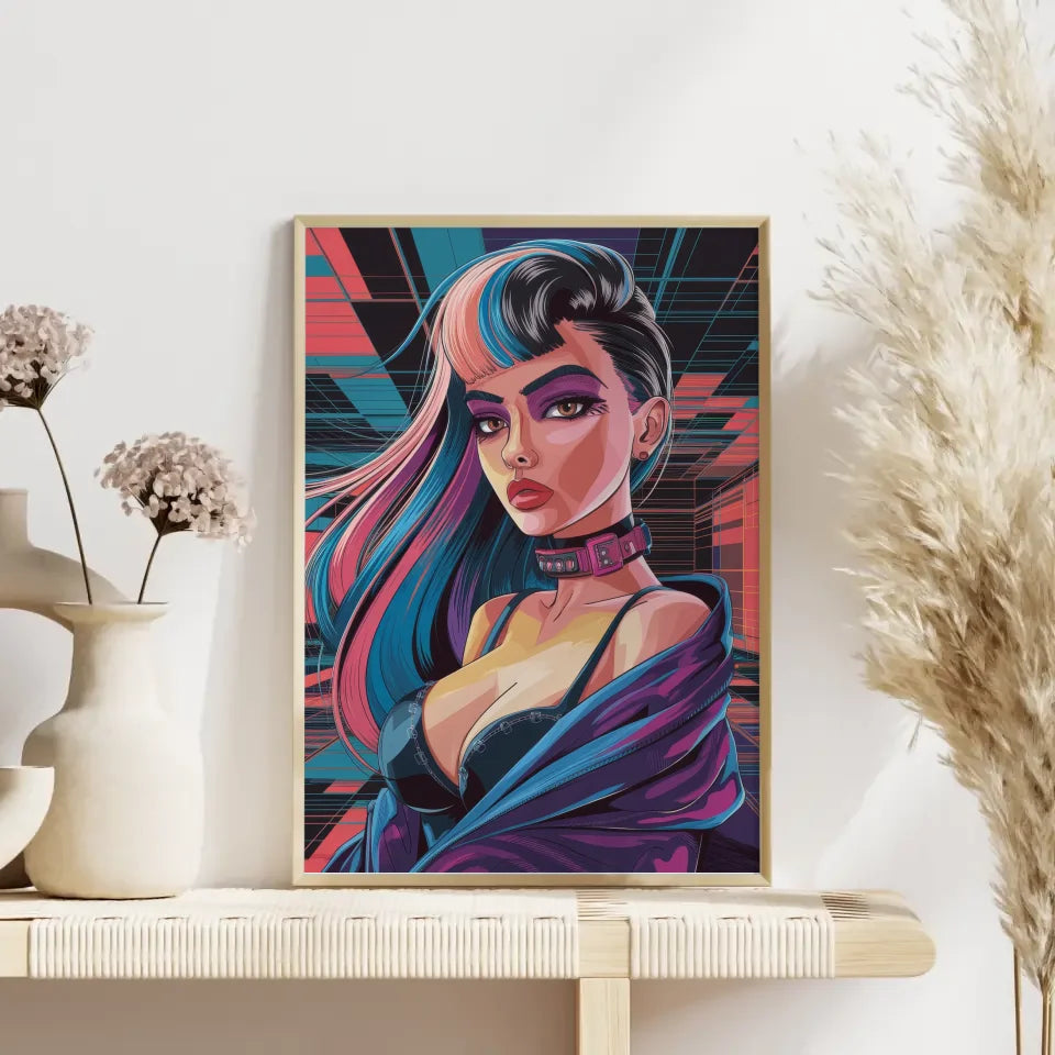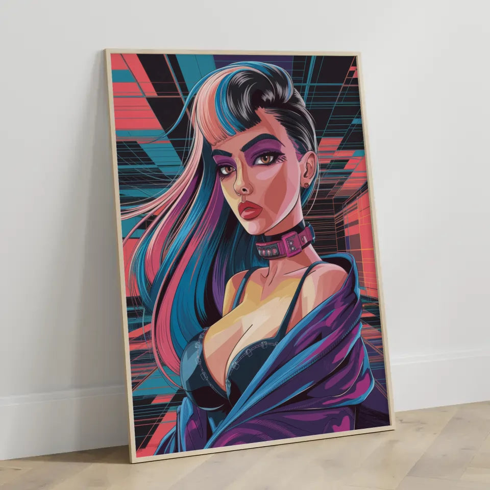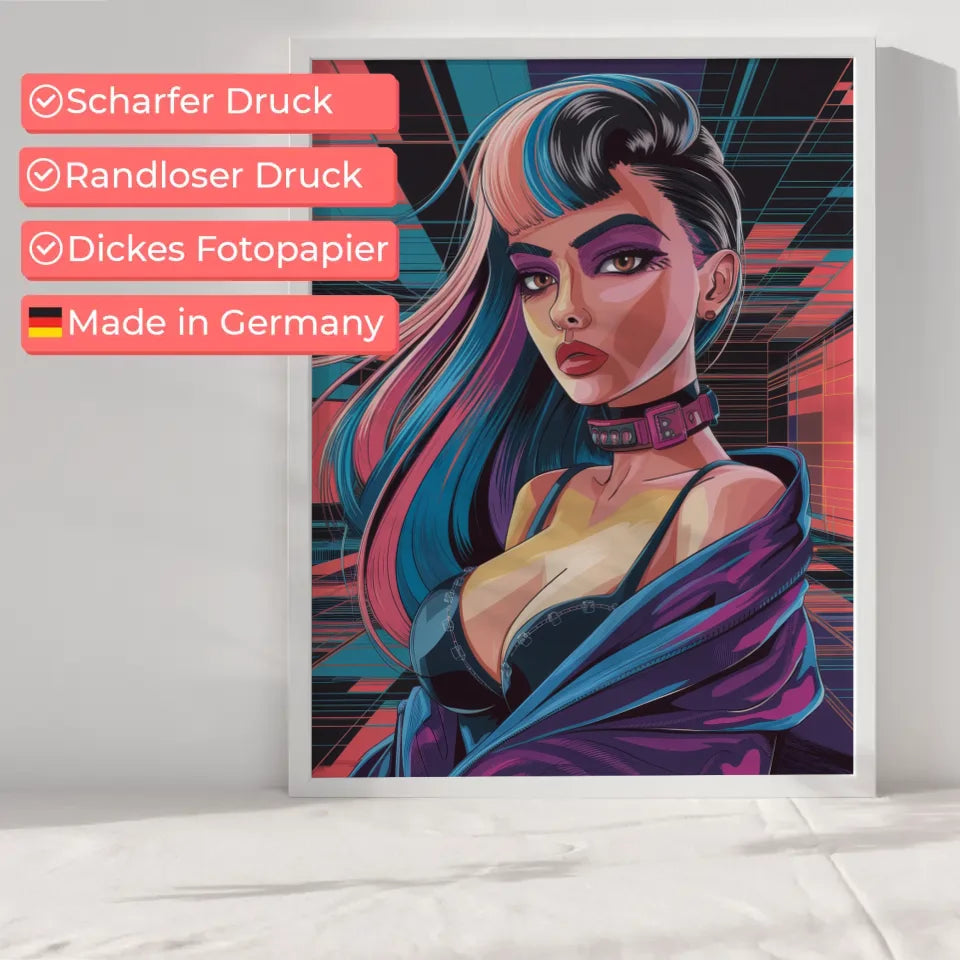 Entdecken Sie unser atemberaubendes futuristisches Poster einer Frau im Cyberpunk Stil, das jede Wand zum Leben erweckt. Dieses einzigartige Poster gehört zur Kategorie Illustration und besticht durch seine lebhaften Farben und detaillierte Ausführung. Die Darstellung zeigt eine Frau mit langen, wallenden Haaren und einem punk-inspirierten Choke, die in einer faszinierenden Cyberpunk-Welt lebt. Die Augen der Frau sind intensiv und werden durch kräftiges Make-up betont, während das Haar in einer lebendigen Farbmischung erstrahlt.