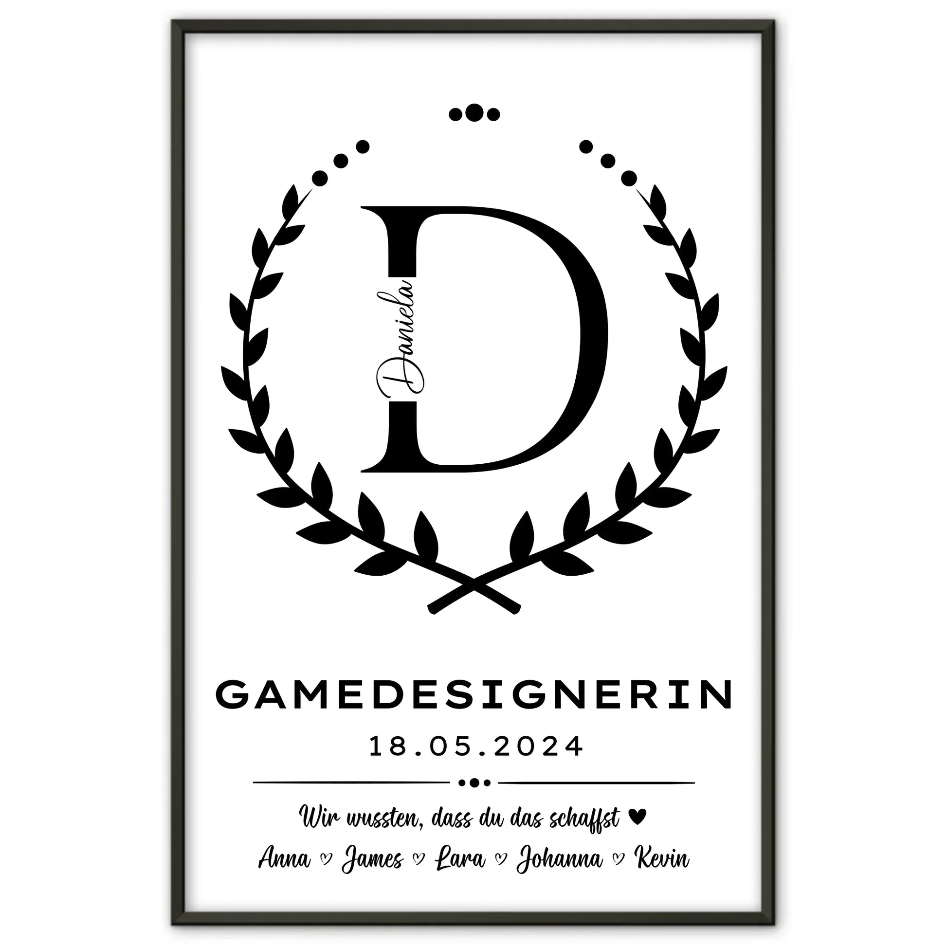 Biete der frischgebackenen Gamedesignerin ein unvergessliches Präsent mit unserem Gamedesignerin Ausbildungsabschluss Geschenk Poster Idee. Bestelle jetzt dein personalisiertes Poster und überrasche mit einem stilvollen und bedeutungsvollen Geschenk zum Abschluss der Ausbildung!