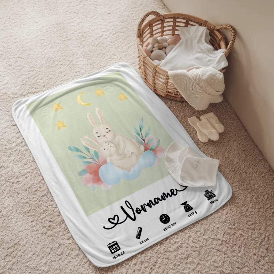 Entdecke die bezaubernde Geburtsdecke personalisiert mit Namen Grünweiß Hasen Mama