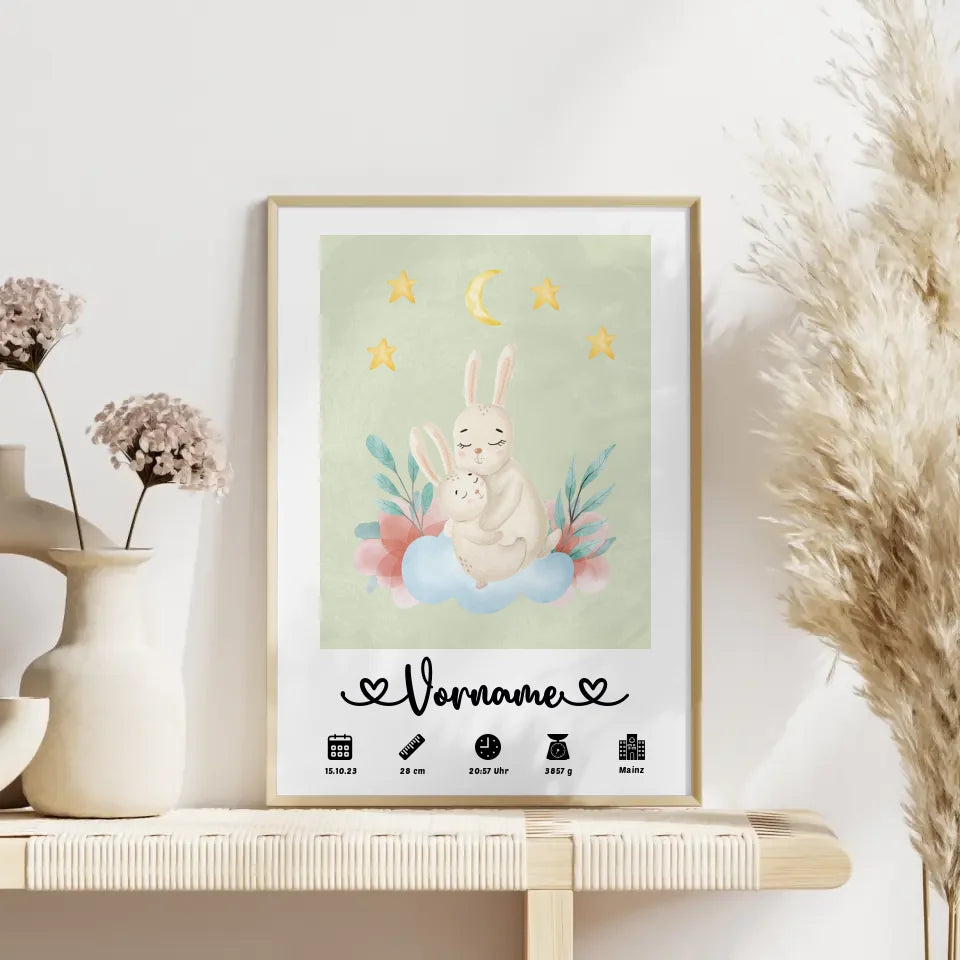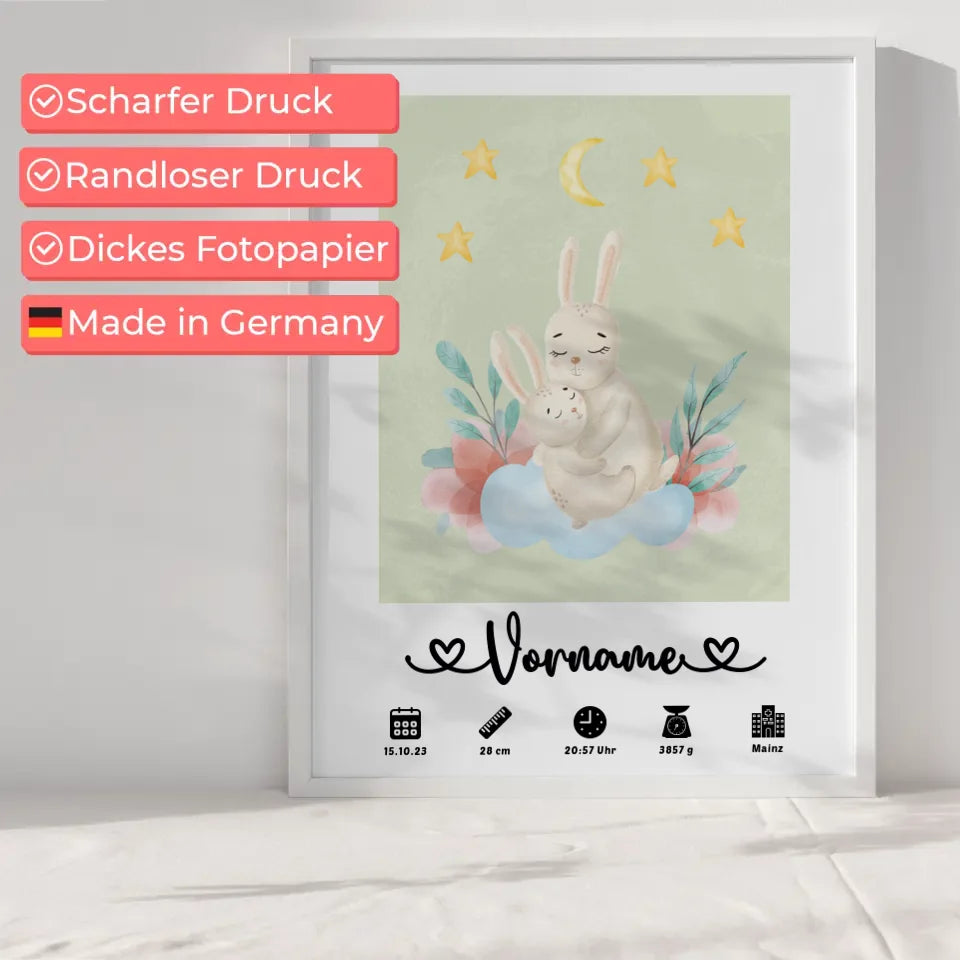 Geburtsposter Personalisiert Geburtsdaten Hasen Mama Grünweiß mit Name