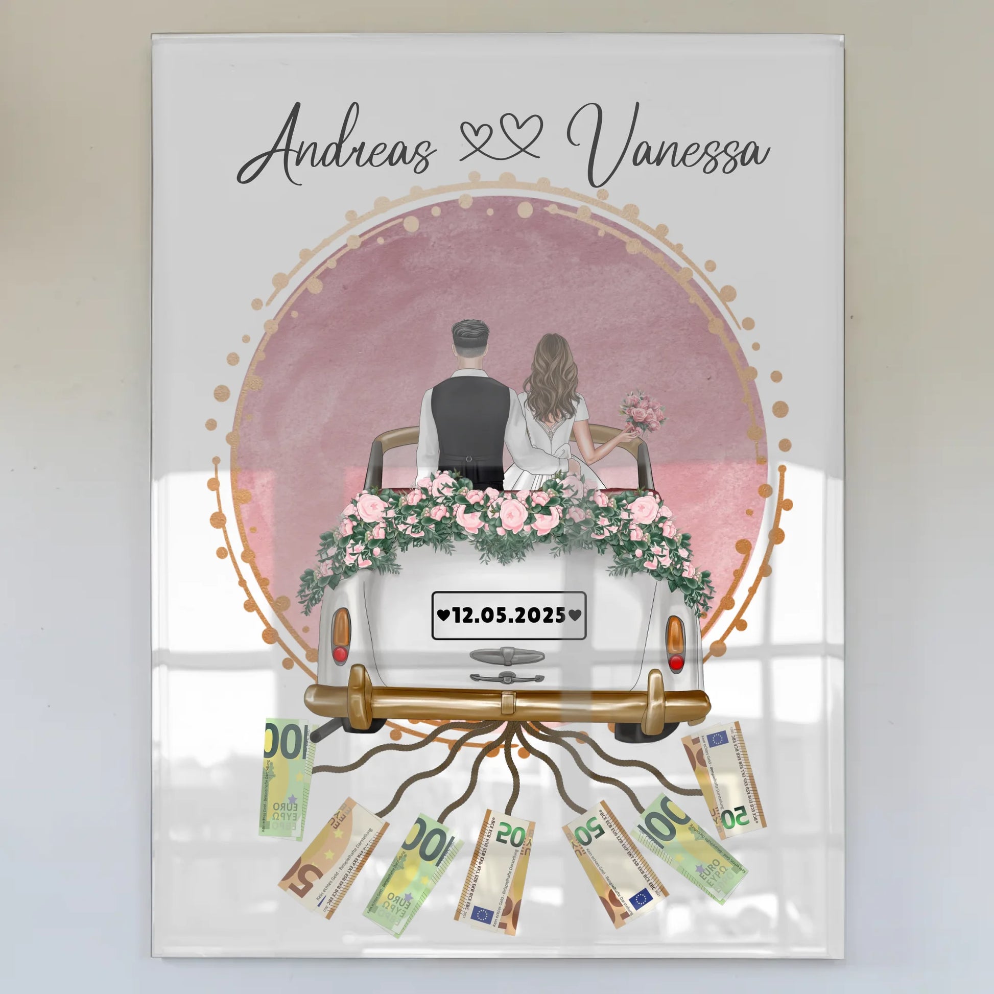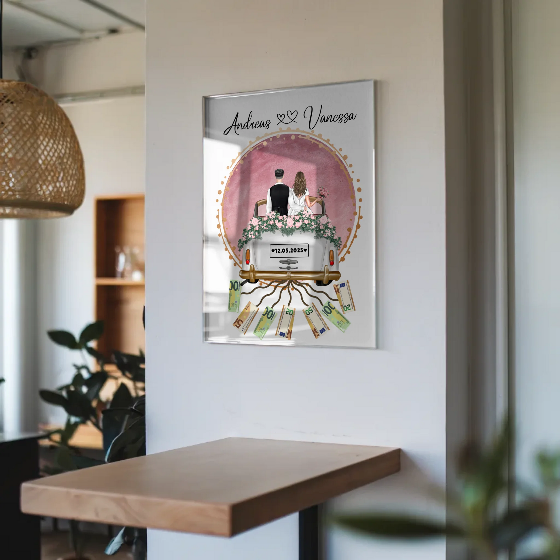 Suchst du nach einem einzigartigen und kreativen Geschenk zur Hochzeit? Unser Geldgeschenk Hochzeit Wandbild Rosa Aquarell Design ist die perfekte Lösung, um deine Glückwünsche und Erinnerungen für das Brautpaar stilvoll zu übermitteln. Dieses individuelle Hochzeitsgeschenk bietet dir die Möglichkeit, Namen, Datum und zwei Cliparts für Paare sowie ein passendes Hintergrundbild zu personalisieren.