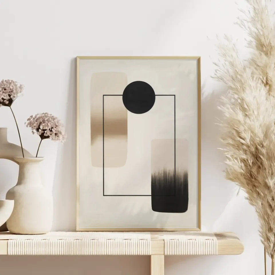 Im Zentrum des Posters dominiert ein großer schwarzer Kreis, der von einem feinen schwarzen Quadrat umrahmt wird. Diese starke Kombination sorgt dafür, dass unser Poster in jedem Raum zum Blickfang wird. Um das geometrische Design zu komplettieren, finden Sie auf der linken Seite eine rechteckige Form mit einem sanften Farbverlauf von hellen zu dunklen Beigetönen. Auf der rechten Seite ergänzt eine dunkelere rechteckige Form mit einem Verlauf von dunklem Beige zu Schwarz die gesamte Komposition. Dies schafft eine perfektionierte Balance und Harmonie in der Gestaltung des Posters.