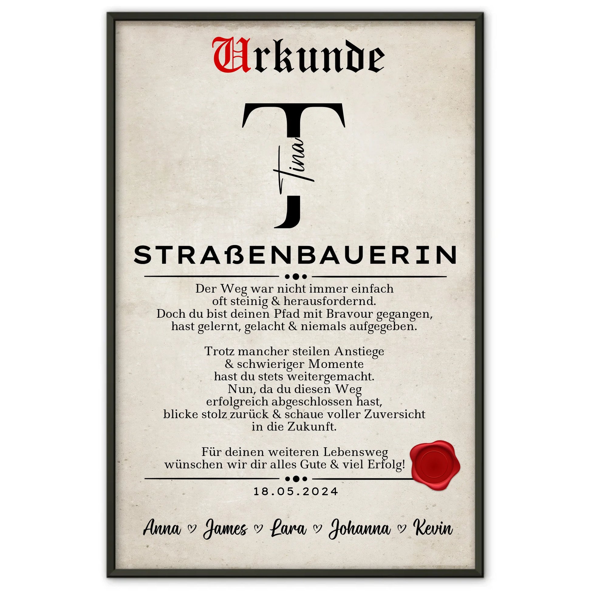 Geschenk Abschluss Ausbildung Straßenbauerin Poster Urkunde – Personalisiertes Ausbildungsabschluss Geschenk