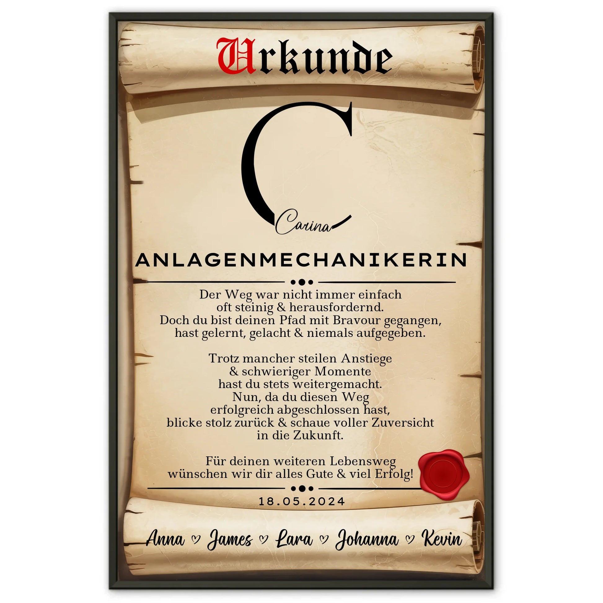 Geschenk Abschluss AusbildungAnlagenmechanikerinPoster Urkunde – Das perfekte personalisierte Geschenk zum Ausbildungsabschluss