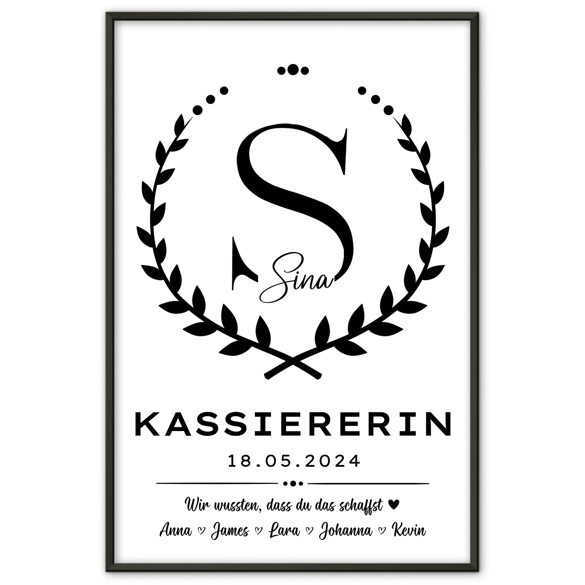 Du suchst ein einzigartiges und persönliches Geschenk zum Abschluss Ausbildung Kassiererin? Unser individuell gestaltbares Poster ist genau das Richtige für dich! Dieses besondere Geschenk zum Abschluss Ausbildung kannst du mit dem Initial Buchstaben, dem Datum und einem Wunschtext personalisieren, sodass es zu einem unvergesslichen Andenken wird. Ob als Geschenk Abschluss Ausbildung oder als Ausbildungsabschluss Geschenk – dieses Poster eignet sich ideal für den Abschied und zeigt deine Wertschätzung auf eine ganz persönliche Weise. Überrasche deine Liebsten mit einem stilvollen und individuellen Geschenk Zum Abschluss Ausbildung, das lange in Erinnerung bleibt.