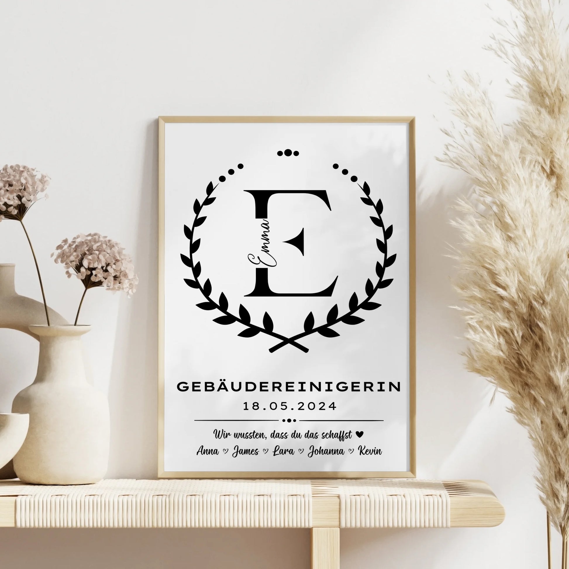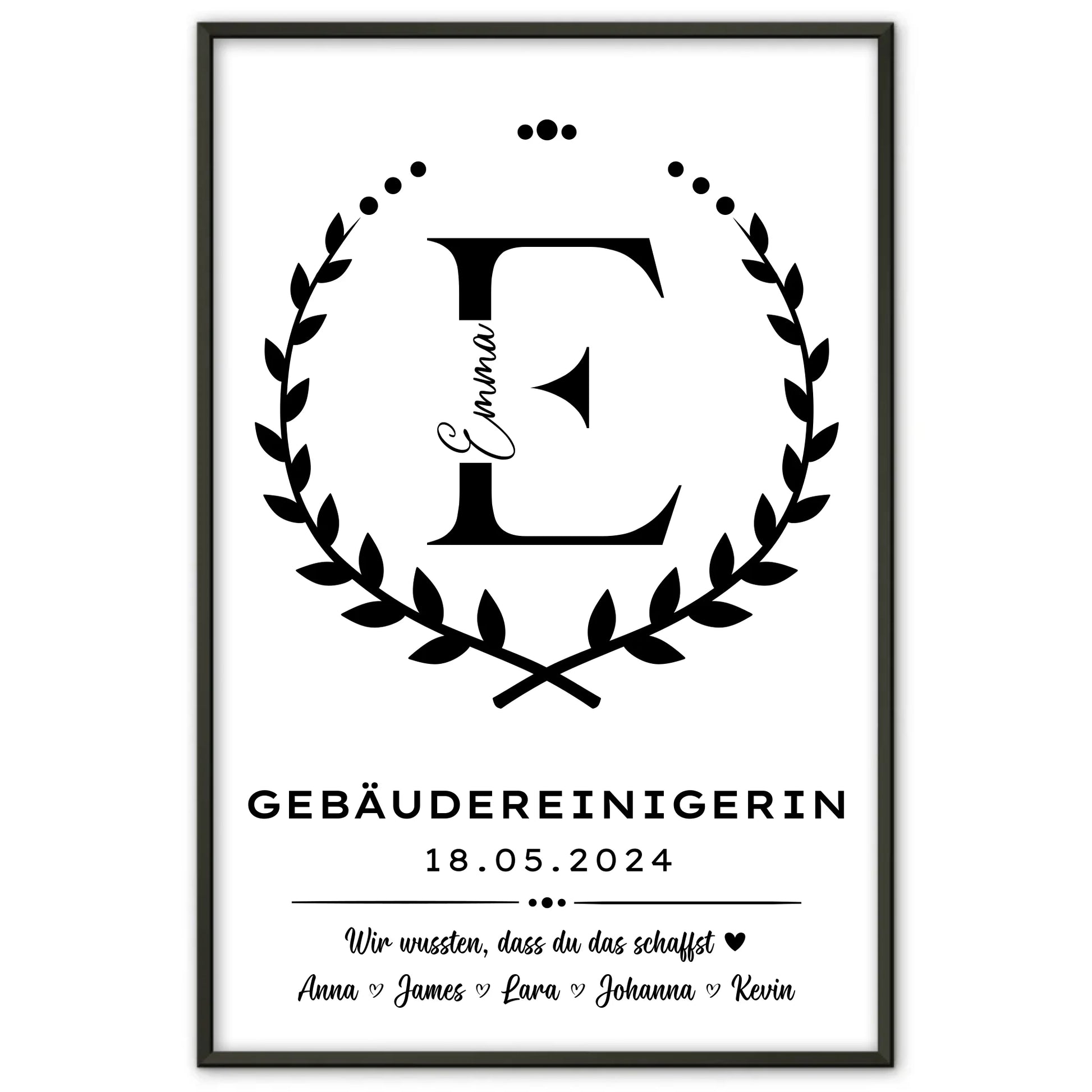 Du suchst ein besonderes Geschenk zum Abschluss Ausbildung für eine Gebäudereinigerin? Unser Geschenk Zum Abschluss Ausbildung Poster Gebäudereinigerin ist die perfekte Wahl, um den Ausbildungsabschluss gebührend zu feiern. Dieses personalisierte Poster kannst du mit dem Initial Buchstaben, dem Datum und einem Wunschtext individuell gestalten und so ein einzigartiges Erinnerungsstück schaffen.