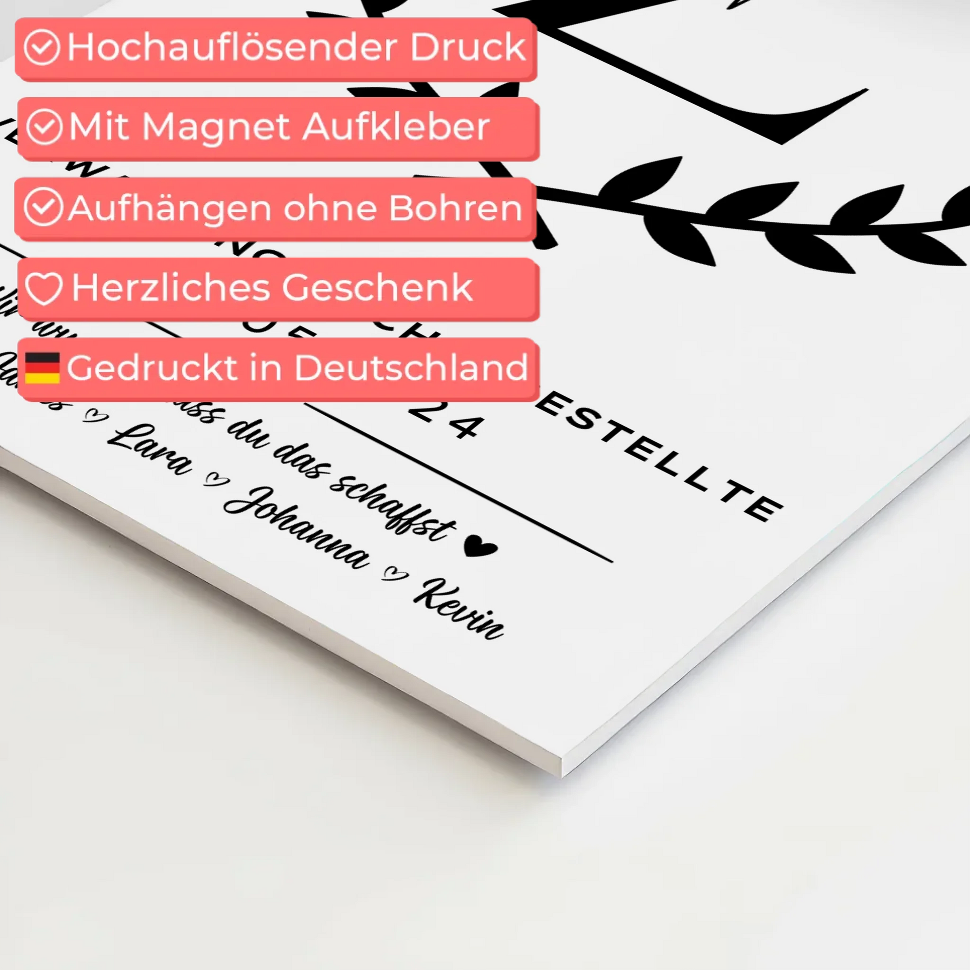 Feiere den erfolgreichen Ausbildungsabschluss mit unserem einzigartigen Geschenk Zum Abschluss Ausbildung Verwaltungsfachangestellte Magnet Wandbild Fotoboard. Dieses individuell gestaltbare Präsent ist perfekt, um dem Absolventen eine besondere Erinnerung zu schenken und den nächsten Schritt im Berufsleben zu würdigen. Das Magnet Wandbild Fotoboard lässt sich ganz nach deinen Wünschen personalisieren: Du kannst den Initial Buchstabe, das Datum sowie einen Wunschtext hinzufügen, um das Geschenk noch persönlicher zu gestalten. Ob als Abschiedsgeschenk oder als Anerkennung für die harte Arbeit während der Ausbildung – dieses kreative Präsent ist ideal für jeden Verwaltungsfachangestellten, der seinen Ausbildungsabschluss feiert. Es eignet sich hervorragend als Ausbildungsabschluss Geschenk und ist eine originelle Art, 'Herzlichen Glückwunsch“ zu sagen. Mit diesem individuell gestalteten Magnet Wandbild Fotoboard wird dein Geschenk zum Blickfang und bleibt lange in Erinnerung. Überrasche deine Freunde oder Kollegen mit einem besonderen Andenken an ihre erfolgreiche Ausbildung und mache den Moment unvergesslich – ein perfektes Geschenk Zum Abschluss Ausbildung, das sowohl praktisch als auch emotional ist.