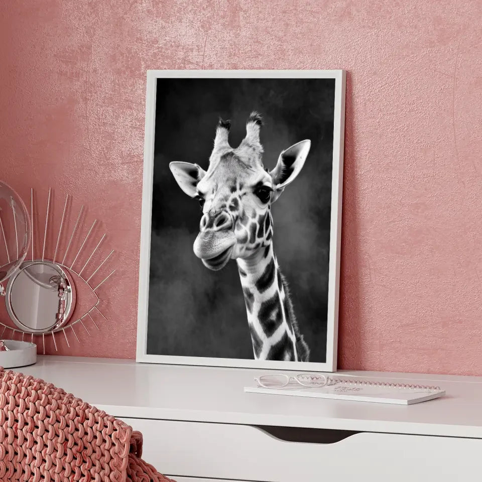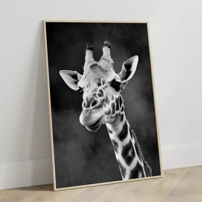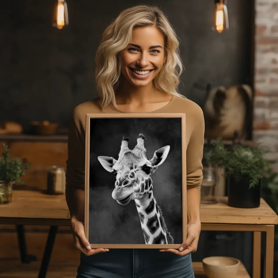 Das Poster besticht durch seine Detailtreue und den faszinierenden Kontrast zwischen dem rauchigen, dunklen Hintergrund und den feinen Gesichtszügen der Giraffe. Es ist nicht nur ein einfaches Wandbild, sondern ein echtes Kunstwerk, das jedes Zimmer in eine stilvolle Oase verwandelt.