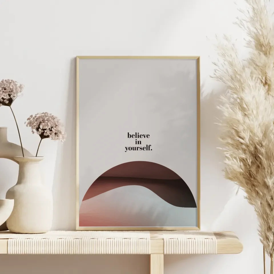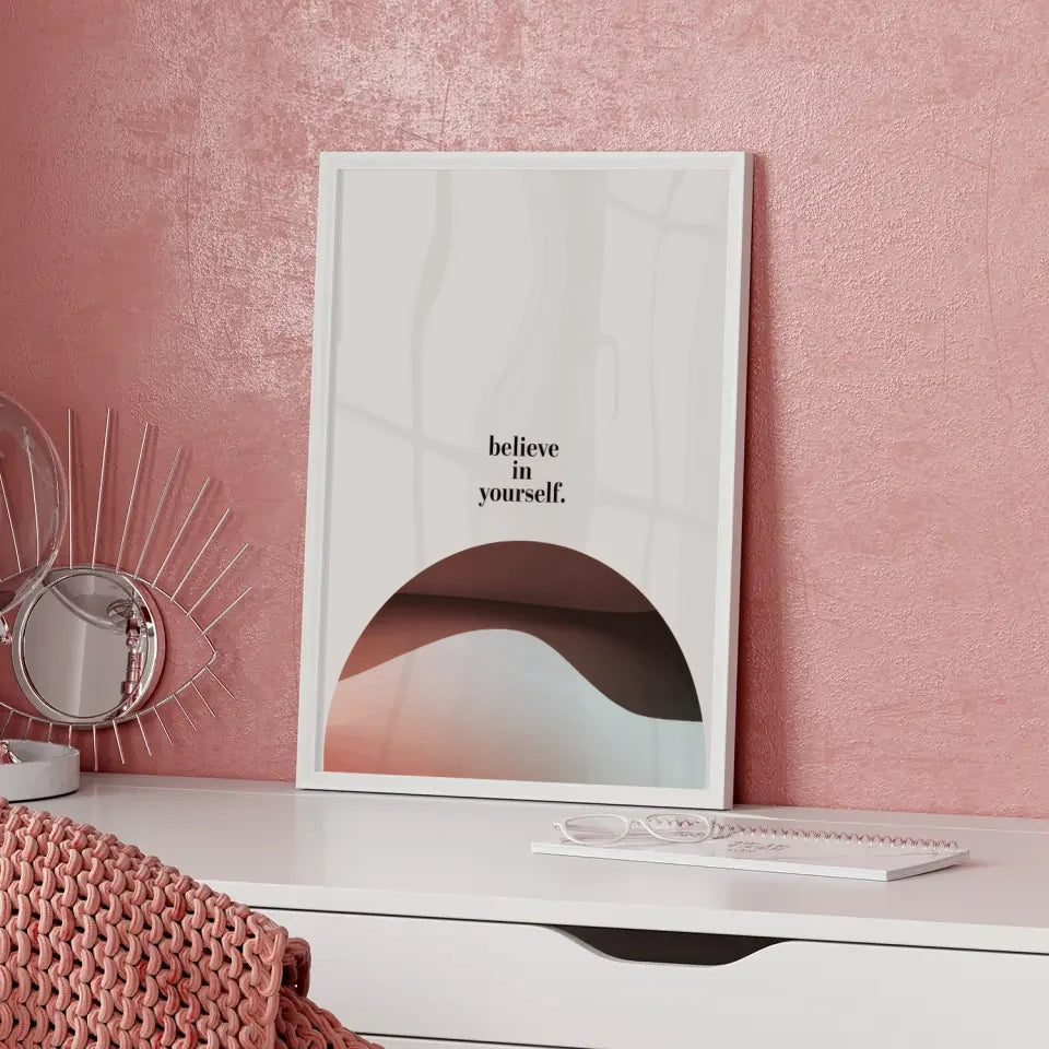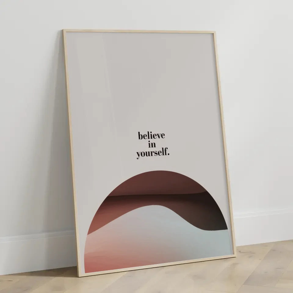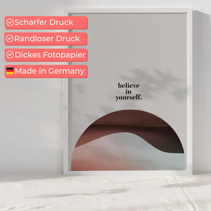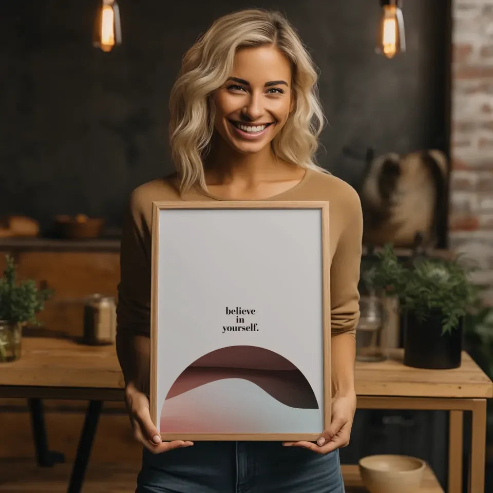 Das Glaube an dich selbst Poster ist perfekt für Ihr Zuhause oder das Büro. Die beruhigende Mischung gedämpfter Farben im Hintergrund sorgt für eine harmonische Umgebung und fördert ein Gefühl der Ruhe und Selbstsicherheit. Jedes Mal, wenn Sie das Poster betrachten, werden Sie ermutigt, Ihre Träume zu verfolgen und Positivität in Ihr Leben zu bringen.
