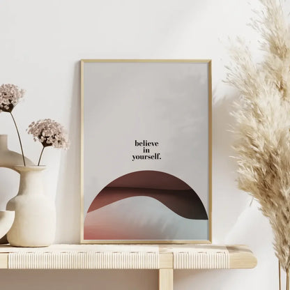 Entdecken Sie unser inspirierendes Glaube an dich selbst Poster, das mit einem minimalistischen Design gestaltet ist und in jedem Raum für eine positive Atmosphäre sorgt. Dieses Poster ist nicht nur ein dekoratives Element, sondern auch eine tägliche Erinnerung an die Kraft des Selbstvertrauens. Die auffällige Gestaltung mit einem kleinen, fetten Text in der Mitte zieht alle Blicke auf sich und motiviert Sie dazu, an sich selbst zu glauben.