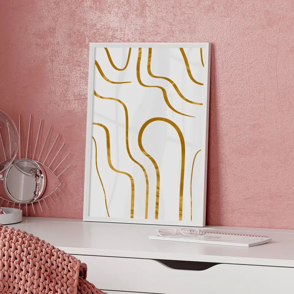 Entdecken Sie unser elegantes minimalistisches Poster mit goldenen Wellenlinien Design, das perfekt in jede moderne Einrichtung passt. Dieses Poster gehört zur Kategorie der abstrakten Kunst und besticht durch seinen überwiegend weißen Hintergrund, der die subtilen goldfarbenen Linien in den Vordergrund stellt. Die geschwungenen, wellenförmigen Linien variieren in Dicke und Krümmung und erzeugen ein faszinierendes Gefühl von Bewegung und Fließfähigkeit. Jedes Detail dieses Posters spricht für Eleganz und Raffinesse, was es zu einem idealen Schmuckstück für Wohnzimmer, Schlafzimmer oder Büroräume macht.
