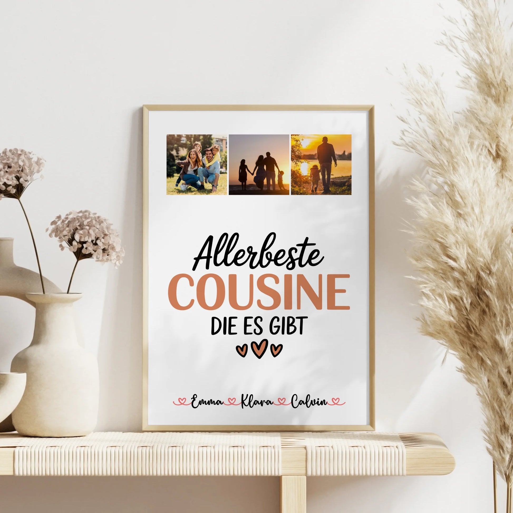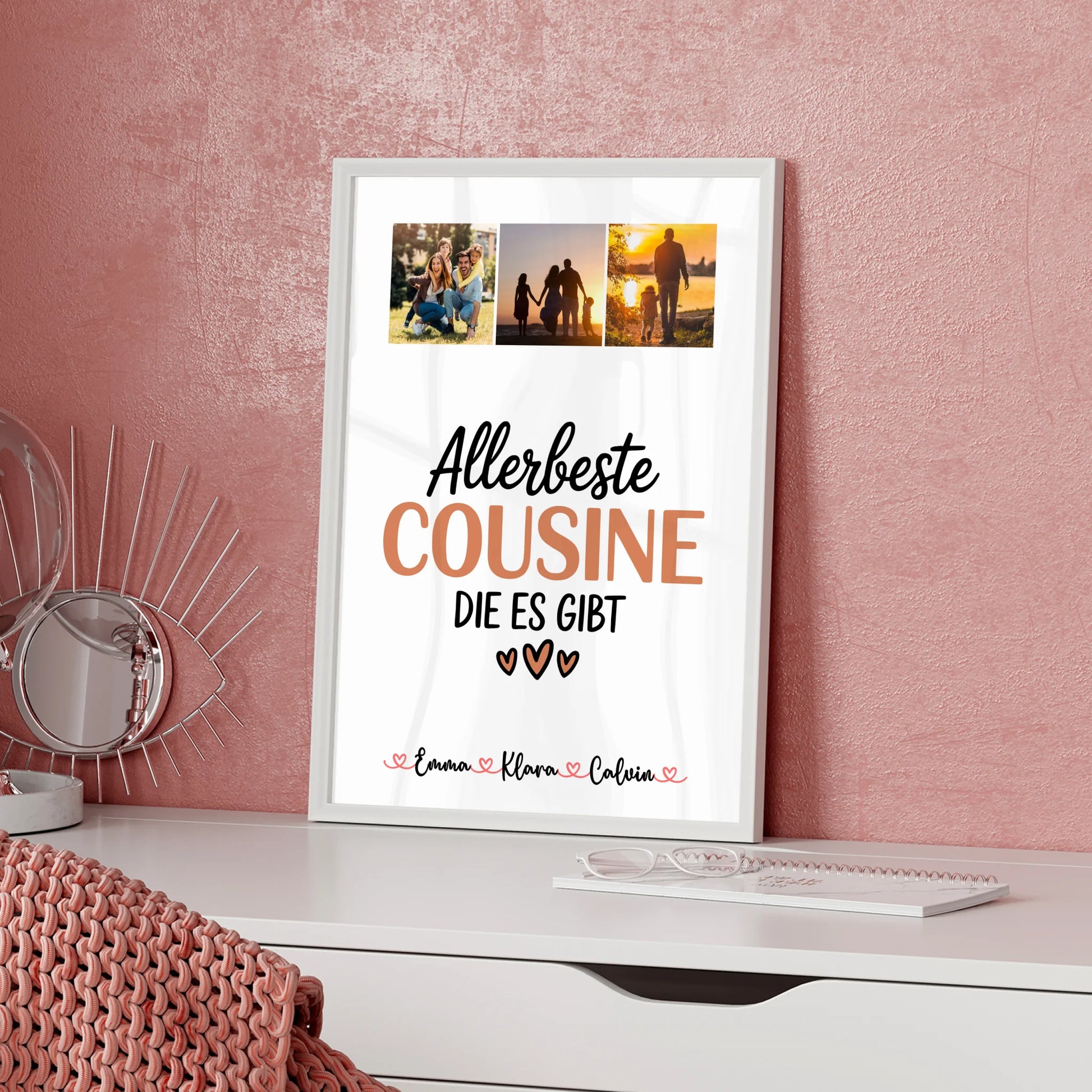 Überrasche deine liebste Cousine mit unserem einzigartigen Geschenk: der personalisierten Fotocollage Großes Bild Aus Vielen Kleinen für die Allerbeste Cousine. Dieses individuelle Geschenk ist perfekt, um eure gemeinsamen Erinnerungen stilvoll und liebevoll zu präsentieren. Du kannst die Fotocollage ganz nach deinem Geschmack gestalten, indem du 3 Fotos, Namen und ein Hintergrundbild deiner Wahl personalisierst. Ob farbige Bilder oder Schwarz-Weiß-Filter - du hast die freie Wahl! Das Design zeigt den schönen Spruch: Allerbeste Cousine Die Es Gibt und macht dieses Geschenk zu etwas ganz Besonderem. Die Gestaltungsmöglichkeiten umfassen einen weißen Hintergrund, florale Motive, Wasserfarben-Style, Holz-Optik oder Muster wie Sterne oder Blüten. Dieses personalisierte Geschenk ist ideal für jeden Anlass und eignet sich perfekt für deine Cousine. Die Fotocollage für Cousine ist ein emotionales Präsent, das garantiert für Freude sorgt und eure Verbundenheit zeigt. Überrasche deine Lieblingscousine mit diesem einzigartigen, individuell gestalteten Geschenk, das Erinnerungen lebendig hält und immer wieder Freude bereitet.