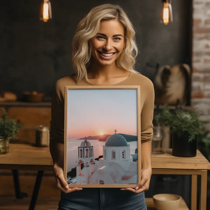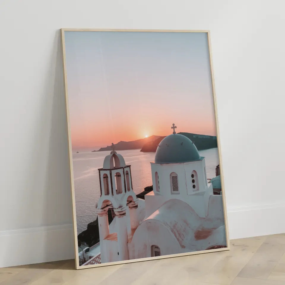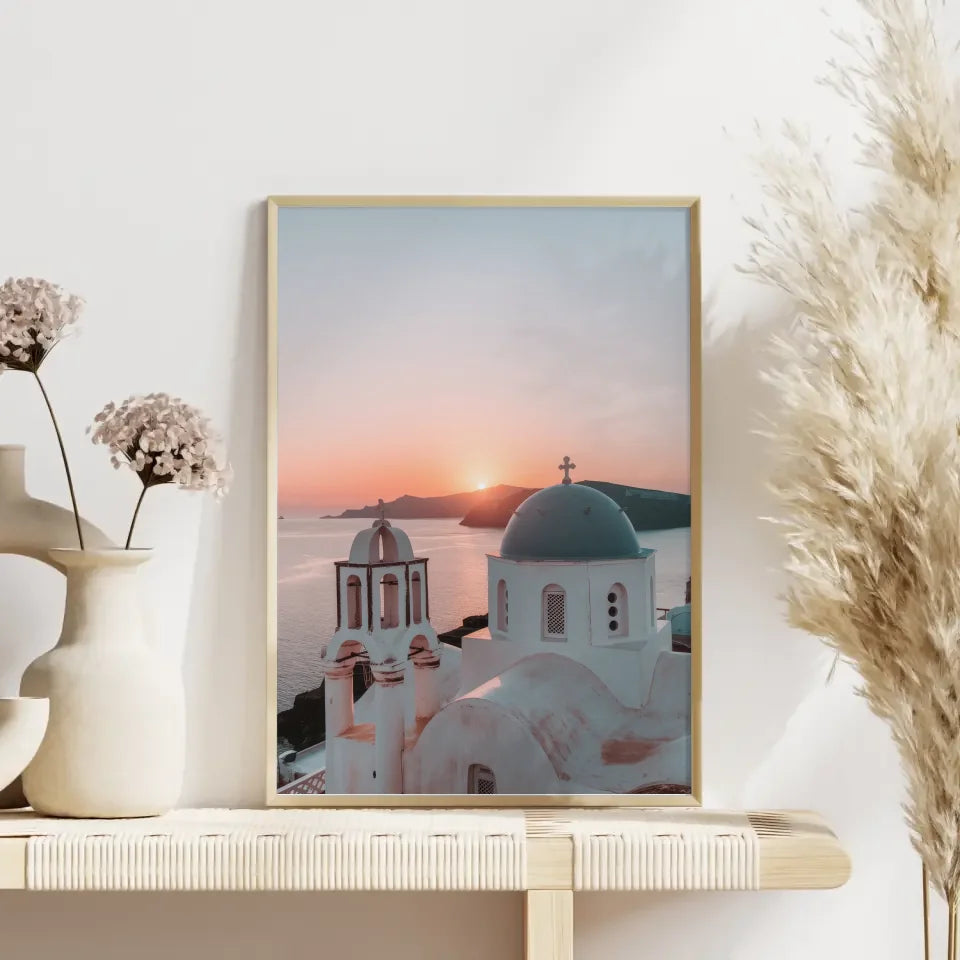 Entdecken Sie unser atemberaubendes Poster, das einen harmonischen Sonnenuntergang über dem Meer mit fesselnder griechischer Architektur zeigt. Dieses Poster vereint Kunst und Architektur auf wunderbare Weise und wird Ihr Zuhause zum Strahlen bringen. Die goldenen Farbtöne der untergehenden Sonne verschmelzen perfekt mit dem klaren Himmel und schaffen eine traumhafte Atmosphäre. Im Vordergrund sind traditionell weiß getünchte Gebäude zu sehen, die die Schönheit der griechischen Baukunst widerspiegeln. Eines dieser Gebäude beeindruckt mit einer markanten Kuppel, die von einem Kreuz gekrönt wird, während das benachbarte Gebäude ebenfalls die religiöse Symbolik aufgreift. Das ruhige Meer in der Mitte des Posters spiegelt die sanften Farben des Himmels wider und schafft eine friedliche Stimmung. Die leichten Silhouetten von Hügeln oder Bergen im Hintergrund verleihen dem Bild zusätzlich Tiefe und laden zum Träumen ein. Dieses Poster ist nicht nur ein Blickfang, sondern auch eine Einladung, sich in die magische Welt der griechischen Architektur zu verlieren. Sichern Sie sich jetzt Ihr Exemplar des Harmonischen Sonnenuntergang Posters und verwandeln Sie Ihre Wände in ein Kunstwerk, das jeden Raum zum Leben erweckt.