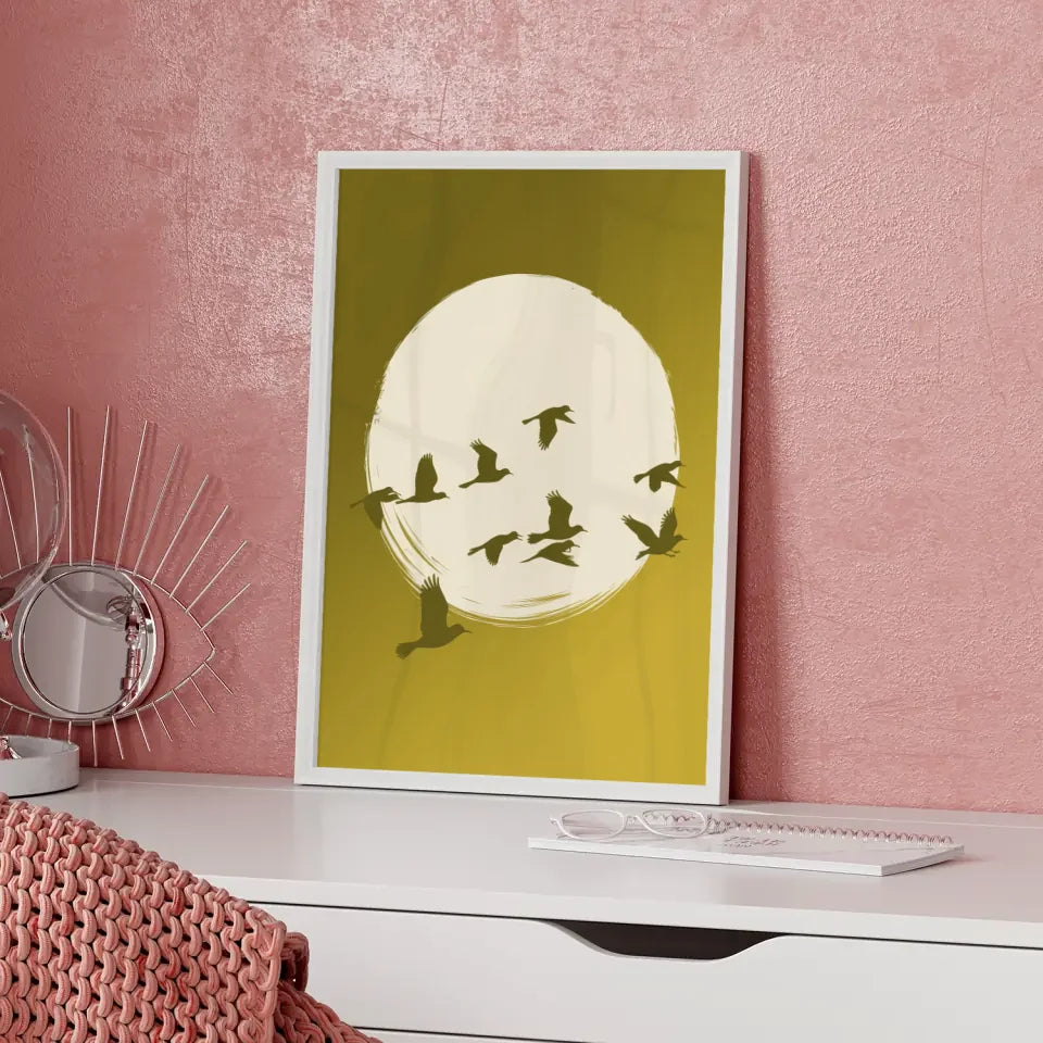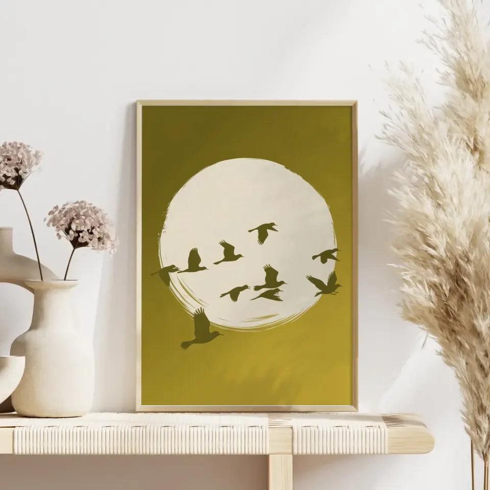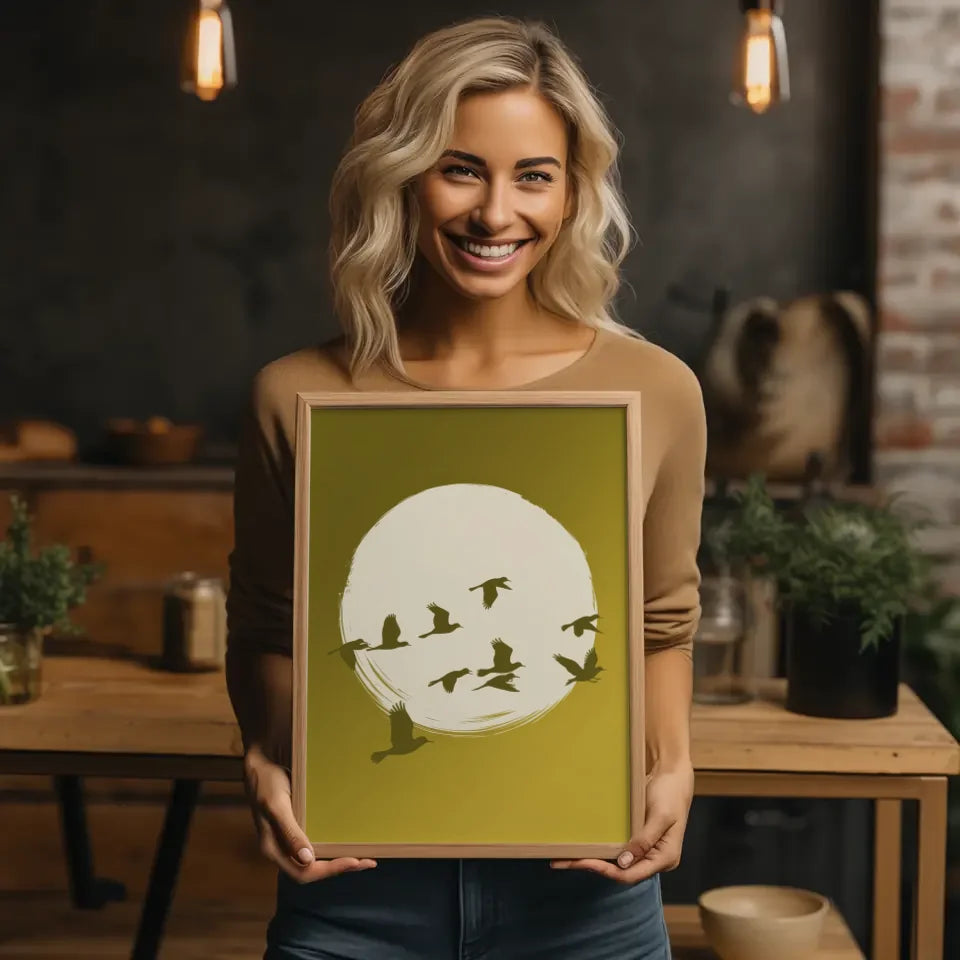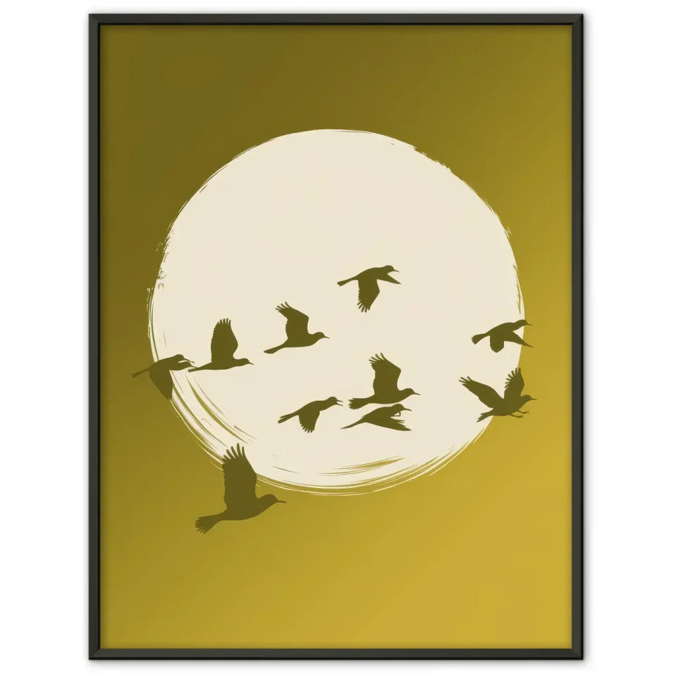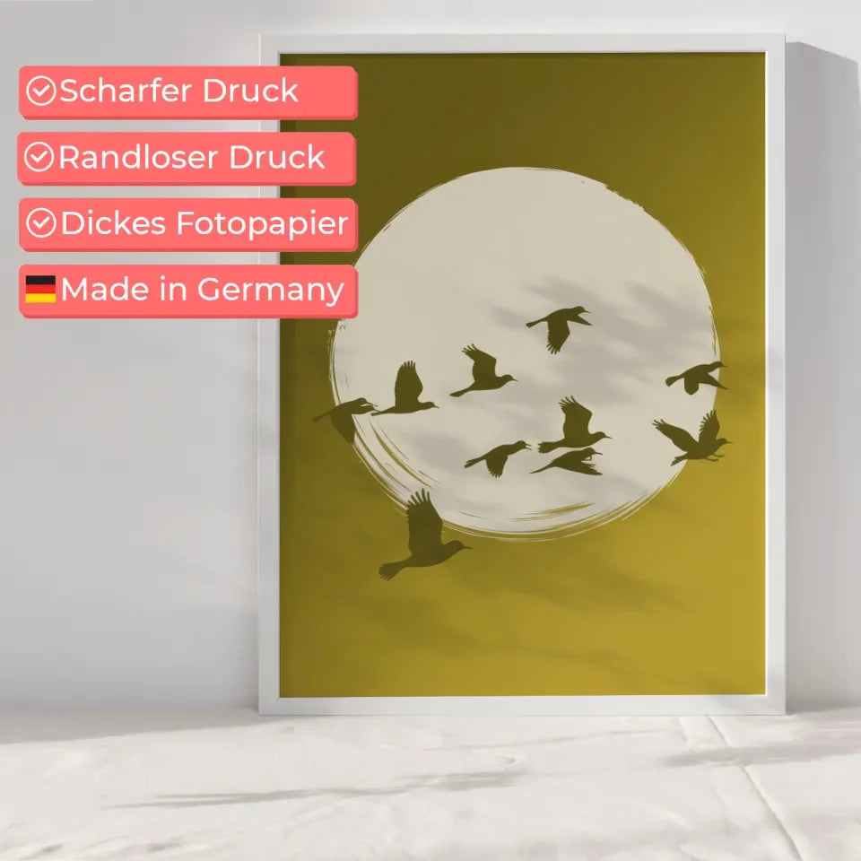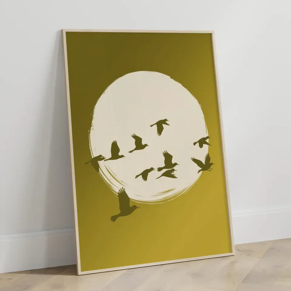 Entdecken Sie unser heiteres Poster mit Vögeln und gelbem Farbverlauf im Hintergrund, das Ihrer Wand einen frischen und lebendigen Akzent verleiht. Dieses einzigartige Wandbild, das zur Kategorie Abstrakt gehört, zeigt eine ruhige Szene mit einem großen, weißen Kreis, der vor einem warmen, gelben Hintergrund mit sanftem Farbverlauf schwebt. In diesem Kreis sind mehrere Silhouetten fliegender Vögel zu sehen, die gekonnt über den Kreis verteilt sind. Einige Vögel fliegen höher, während andere näher am Boden verweilen, was ein Gefühl von Dynamik und Freiheit vermittelt.