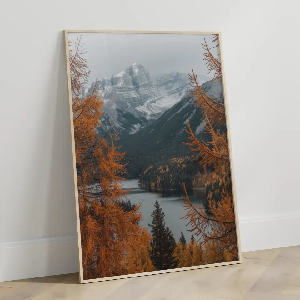 Entdecken Sie unser einzigartiges Herbstliche Landschaft Poster mit Bäumen und schneebedeckten Bergen, das Ihre Wände in ein Kunstwerk verwandelt. Dieses eindrucksvolle Poster zeigt eine atemberaubende Landschaft im Herbst, in der leuchtend orangefarbenes und gelbes Laub der Bäume die Szenerie einrahmt. Poster dieser Art bringen die Farben und die Ruhe der Natur direkt in Ihr Zuhause. Im Vordergrund des Posters befinden sich prächtige Bäume, die einen ruhigen See umringen, der die Schönheit der umgebenden Natur widerspiegelt. Im Hintergrund erheben sich majestätische schneebedeckte Berge, deren Gipfel den bewölkten Himmel durchdringen. Diese Szenerie strahlt ein Gefühl von Frieden und der herrlichen Schönheit der Natur während des Herbstes aus. Verleihen Sie Ihren Wänden mit diesem Poster einen Hauch von natürlicher Eleganz und genießen Sie die harmonische Atmosphäre, die es in jeden Raum bringt. Ideal für Wohnzimmer, Schlafzimmer oder Arbeitsbereich – unser Herbstliche Landschaft Poster mit Bäumen und schneebedeckten Bergen ist das perfekte Deko-Element für Naturliebhaber.