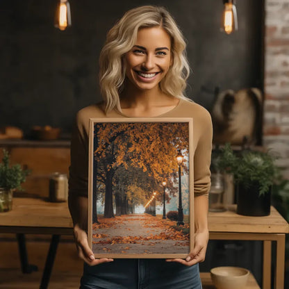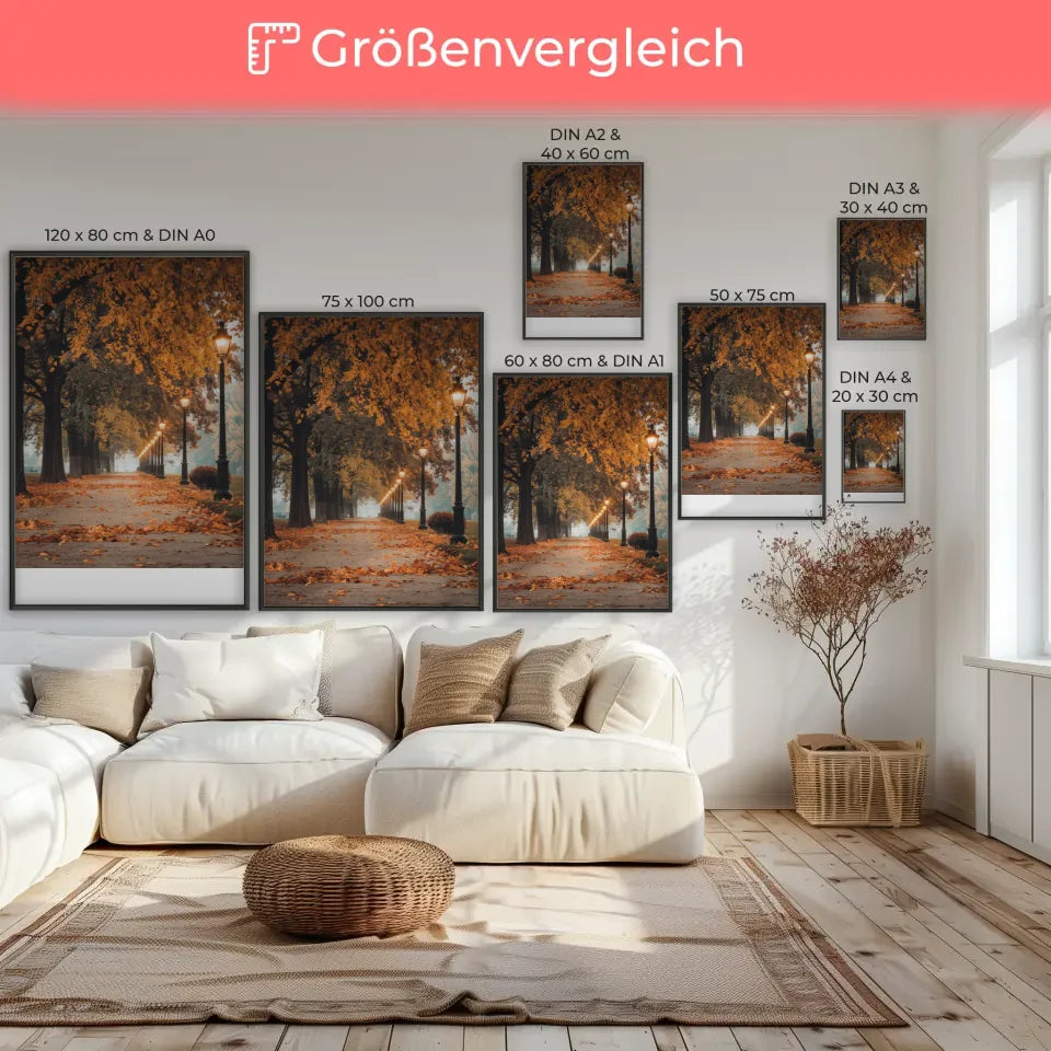 Verleihen Sie Ihrem Zuhause eine gemütliche und entspannende Atmosphäre mit unseren herbstlichen Postern. Dieses besondere Poster zeigt eine ruhige Herbstszene in einem malerischen Park, perfekt für alle, die die Schönheit der goldenen Jahreszeit schätzen. Der gepflasterte Weg, bedeckt mit abgefallenen orangefarbenen und gelben Blättern, schlängelt sich harmonisch durch die friedliche Umgebung. Auf beiden Seiten des Weges erheben sich hohe Bäume mit leuchtendem Herbstlaub, die mit ihren warmen Farbtönen jeden Raum zum Strahlen bringen.