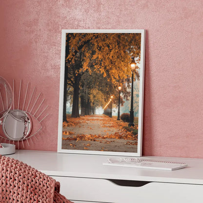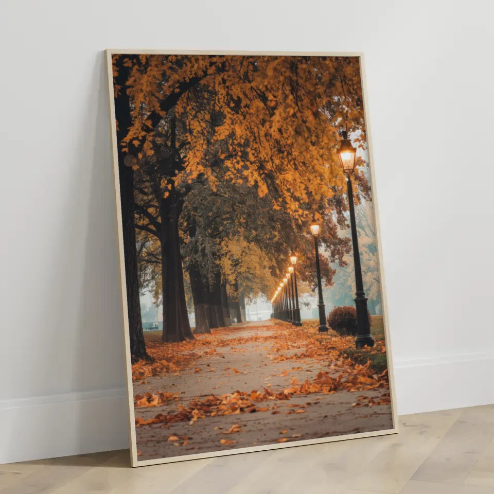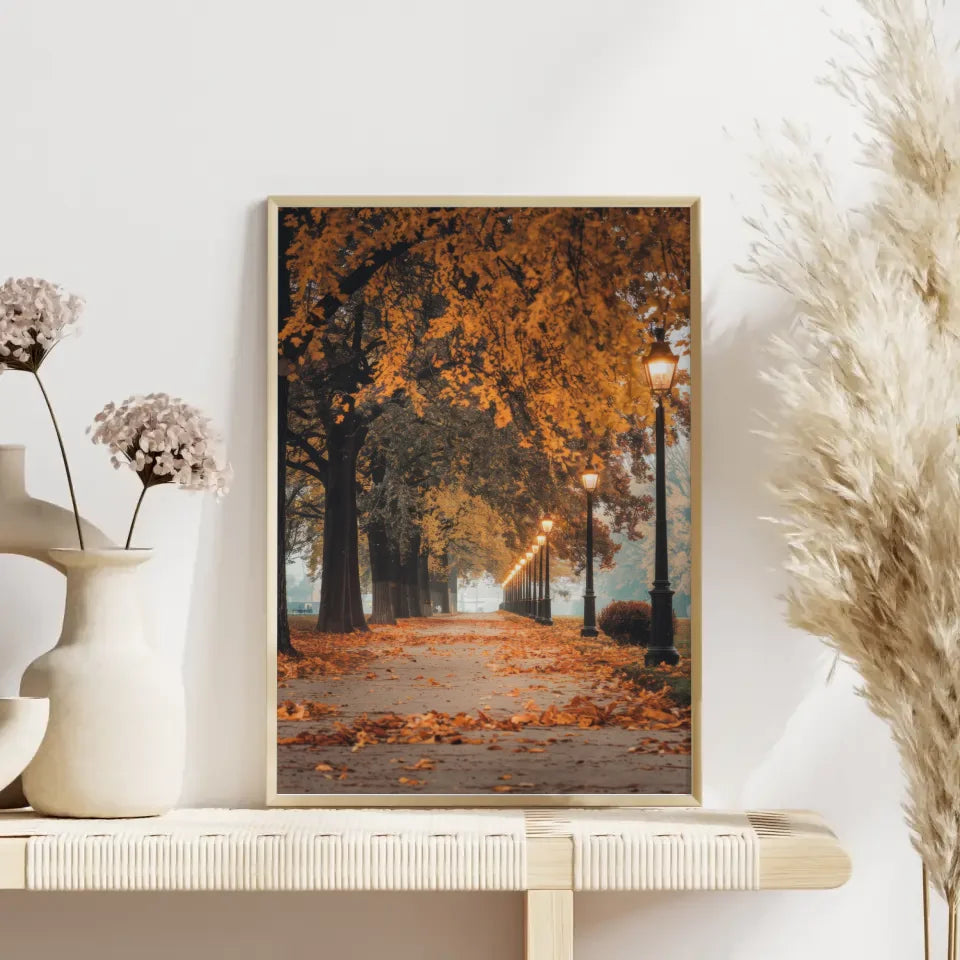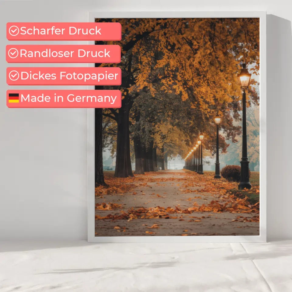 Die nostalgischen Laternenpfähle, die den Weg säumen, verleihen dem Bild einen zusätzlichen Charme. Ihre charakteristischen schwarzen Eisenrahmen und die strahlenden Lampen sorgen für eine einladende Stimmung, die an entspannte Spaziergänge im Park erinnert. Der leicht verschwommene Hintergrund, möglicherweise durch Morgennebel oder einen Weichzeichnungseffekt erzeugt, verstärkt die verträumte Atmosphäre dieses beeindruckenden Posters. Unsere Herbstbilder sind die ideale Wahl, um einen Hauch von Natur und Eleganz in Ihr Zuhause zu bringen.
