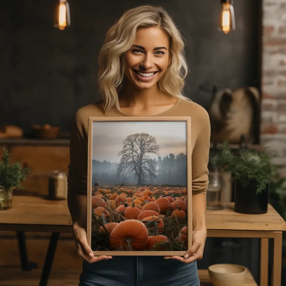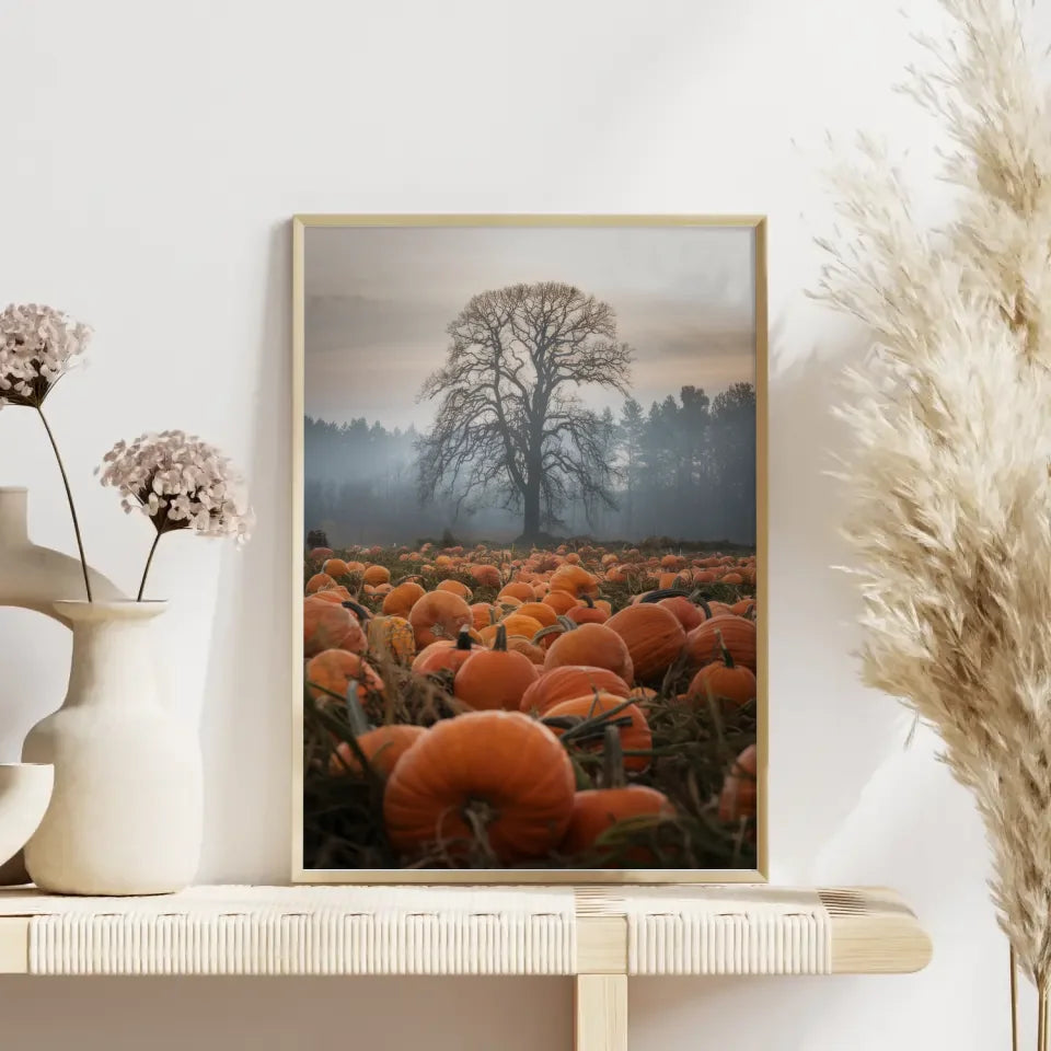 Gestalten Sie Ihr Zuhause mit unserem einzigartigen Herbststimmung mit Kürbissen Poster, das perfekt für Naturliebhaber und Deko-Enthusiasten geeignet ist. Dieses beeindruckende Poster zeigt ein weitläufiges Feld voller Kürbisse, die sowohl auf dem Boden liegen als auch stolz an ihren Stielen hängen. Der blattlose Baum im Hintergrund, umgeben von einem nebligen Ambiente und einer Baumreihe in der Ferne, schafft eine ruhige und besinnliche Atmosphäre, die die Schönheit der Natur im Herbst einfängt.