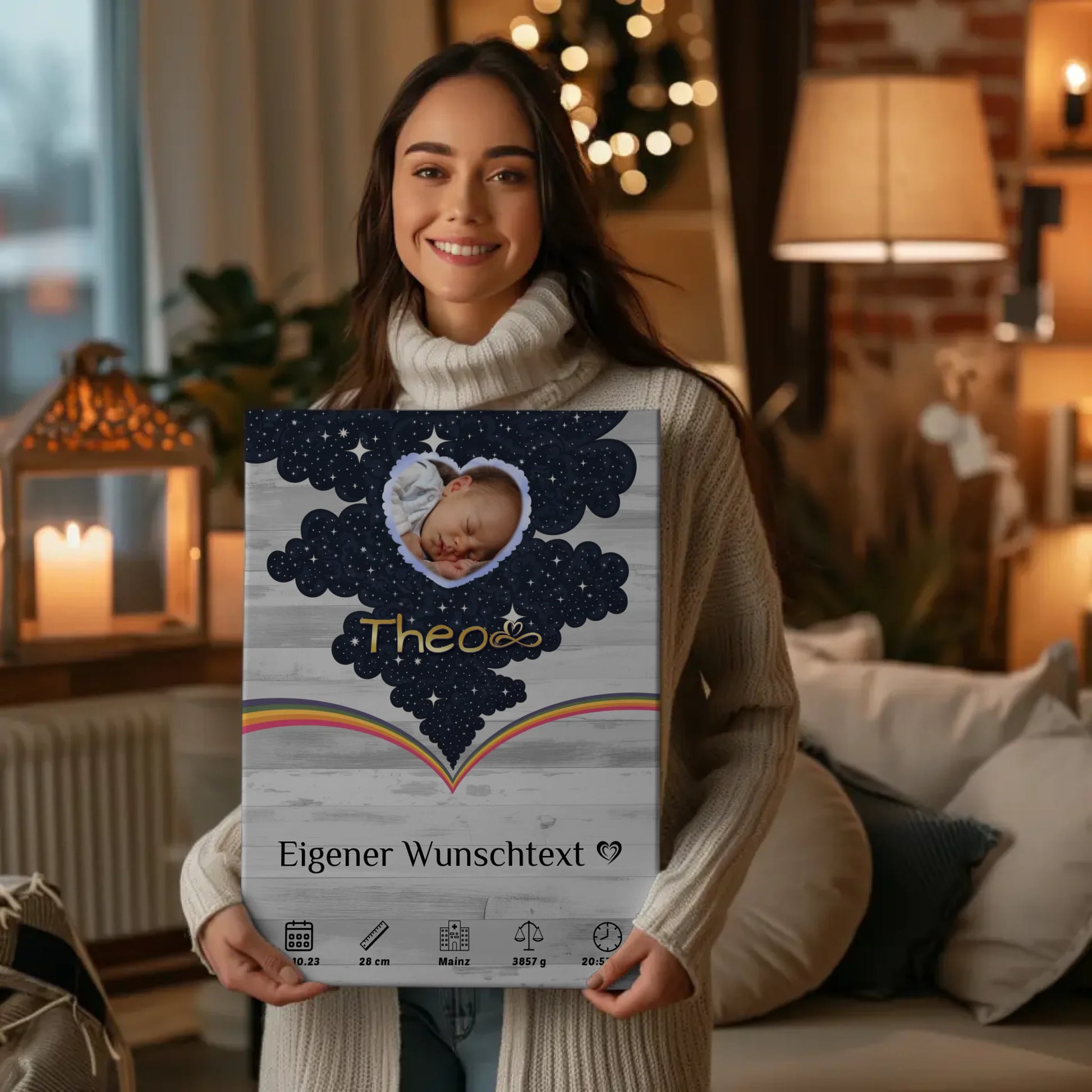 Diese Leinwand zur Geburt eignet sich nicht nur für den eigenen Sprössling, sondern ist auch eine bezaubernde Geschenkidee für frischgebackene Eltern oder werdende Mütter. Überrasche Deine Liebsten mit einem unvergesslichen Geschenk, das bleibende Erinnerungen schafft.
