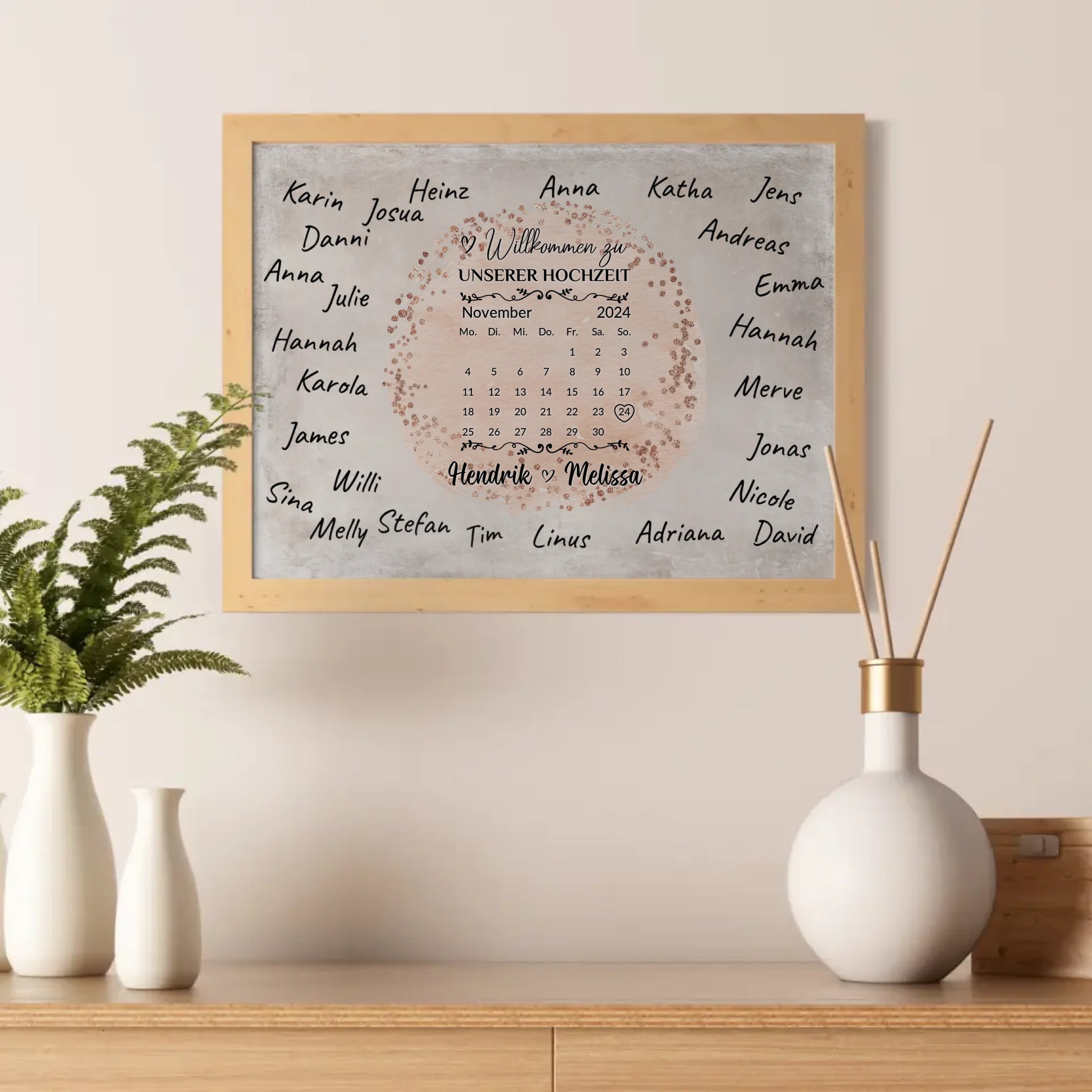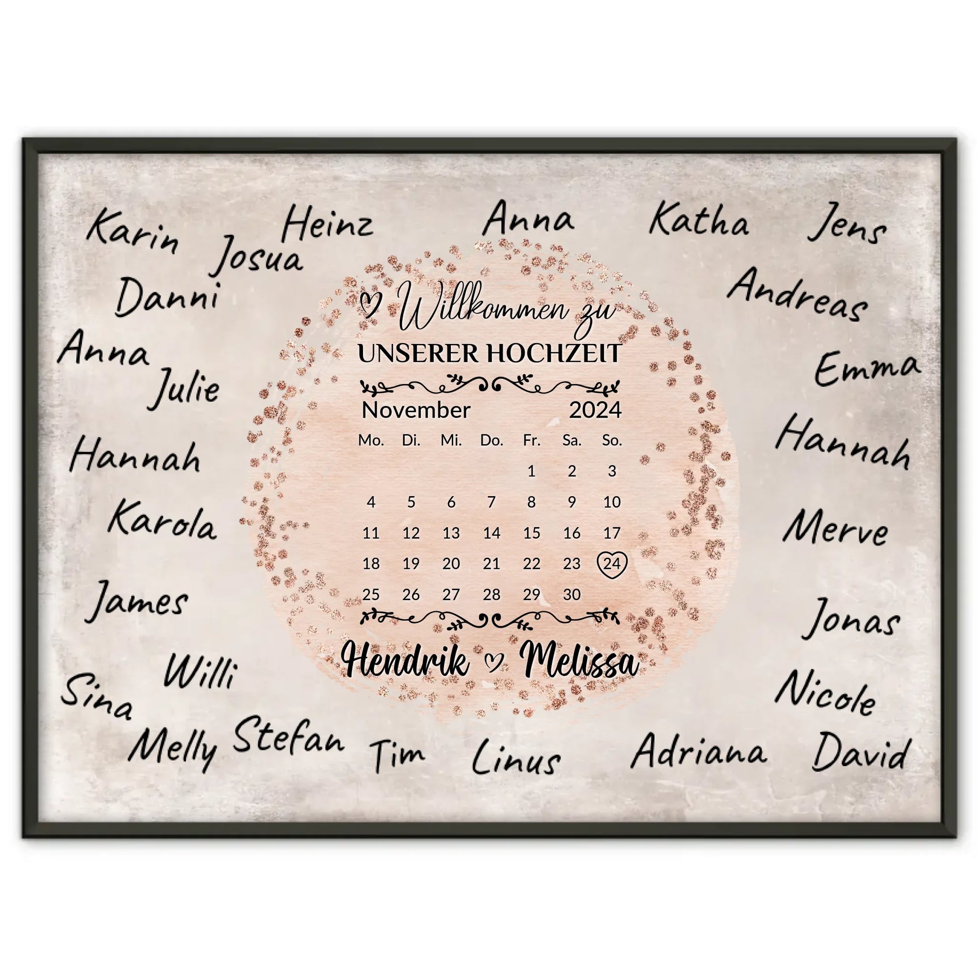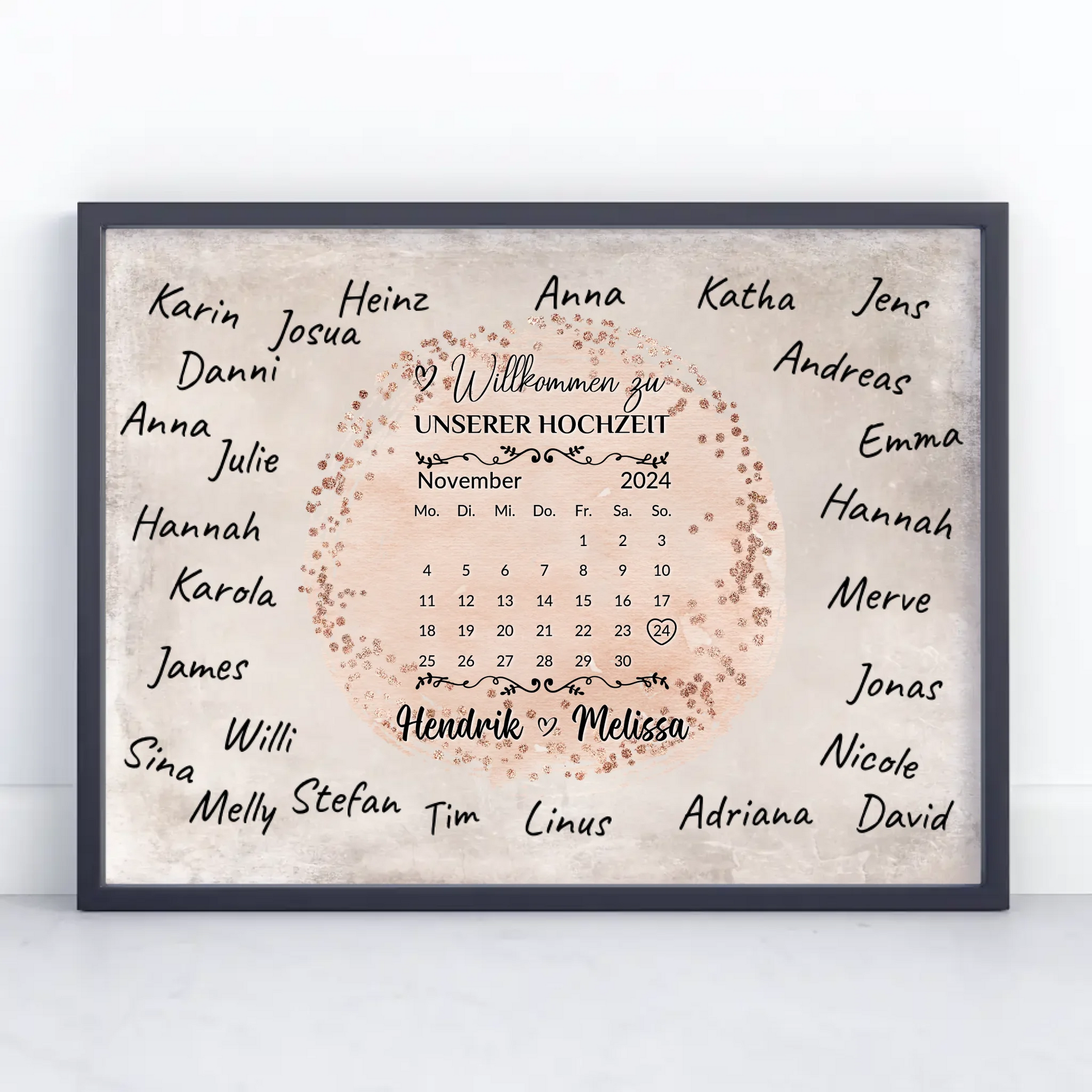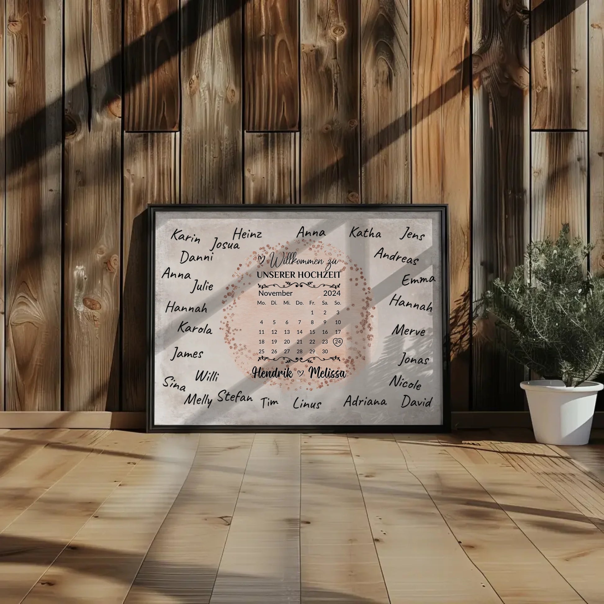 Gestalte dein ganz persönliches Hochzeit Willkommensschild mit unserem einzigartigen Hochzeit Willkommensschild für eigene Unterschriften Farbklecks Rose. Dieses individuell anpassbare Schild ist das perfekte Accessoire für euren großen Tag und schafft sofort eine herzliche Atmosphäre. Du kannst ganz einfach das Datum, die Namen des Brautpaares sowie ein Hintergrundbild auswählen und so euer ganz eigenes, unvergessliches Design kreieren. Zusätzlich bietet es genügend Platz für eigene Unterschriften deiner Gäste – der Stift ist nicht im Lieferumfang enthalten.