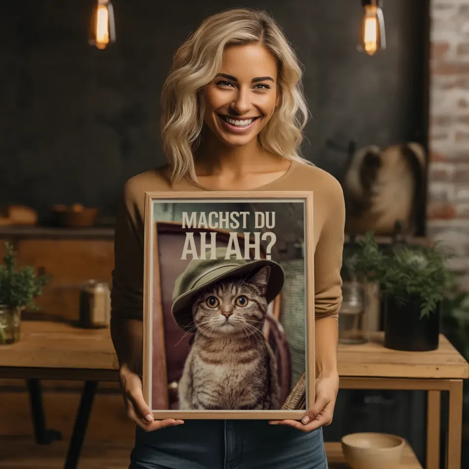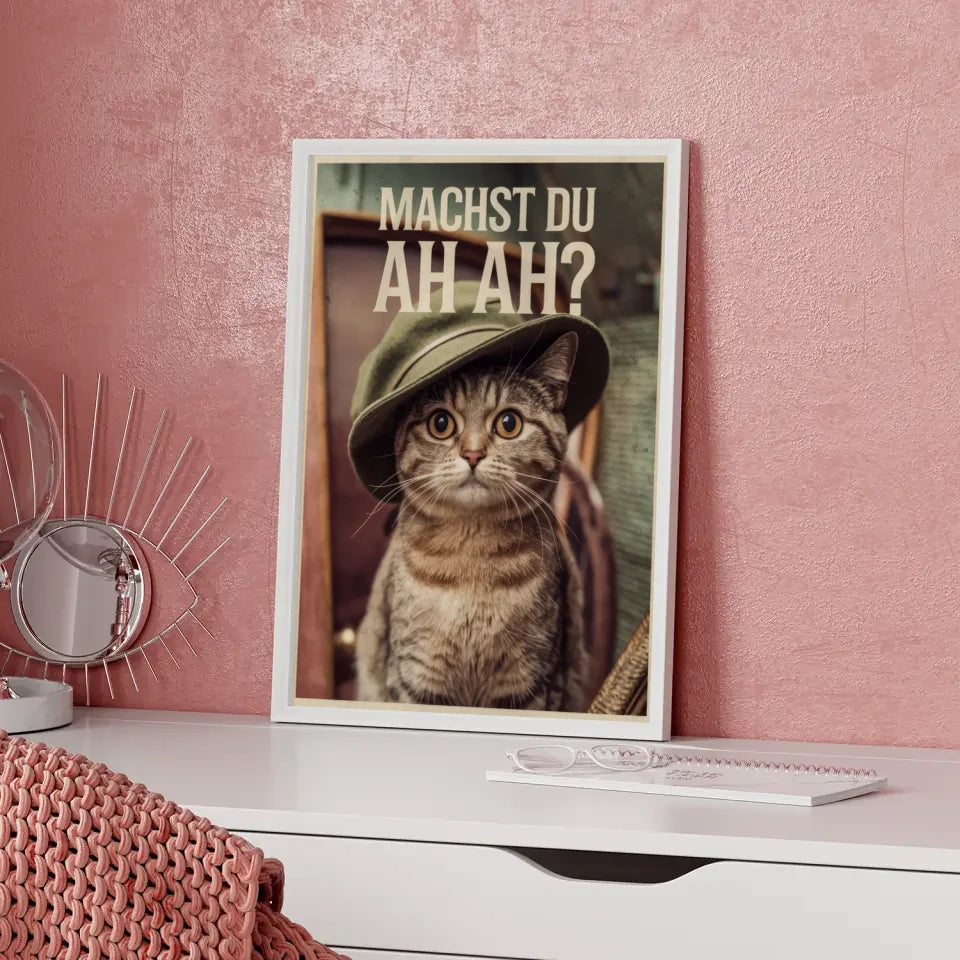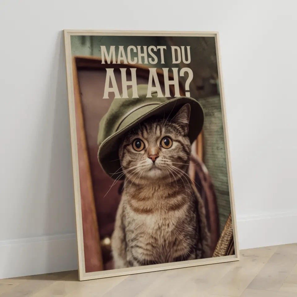 Ein besonderer Blickfang ist der grüne Hut, den die Katze trägt, während sie in einer charmanten Vintage-Umgebung sitzt. Der strukturierte Hintergrund schafft eine besondere Atmosphäre und hebt das Poster hervor, egal wo es aufgehängt wird. Durch die humorvolle Frage 'Machst du Ah Ah?“ oben in großen, fetten Buchstaben wird jeder Raum sofort aufgelockert und sorgt für eine lustige Stimmung.