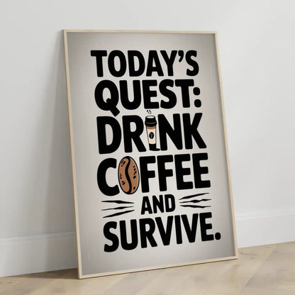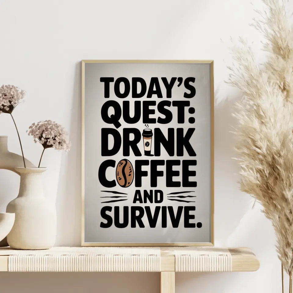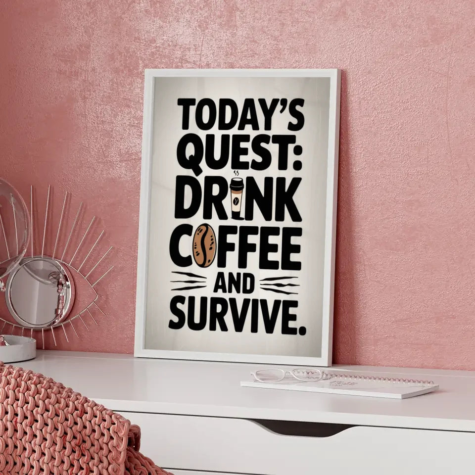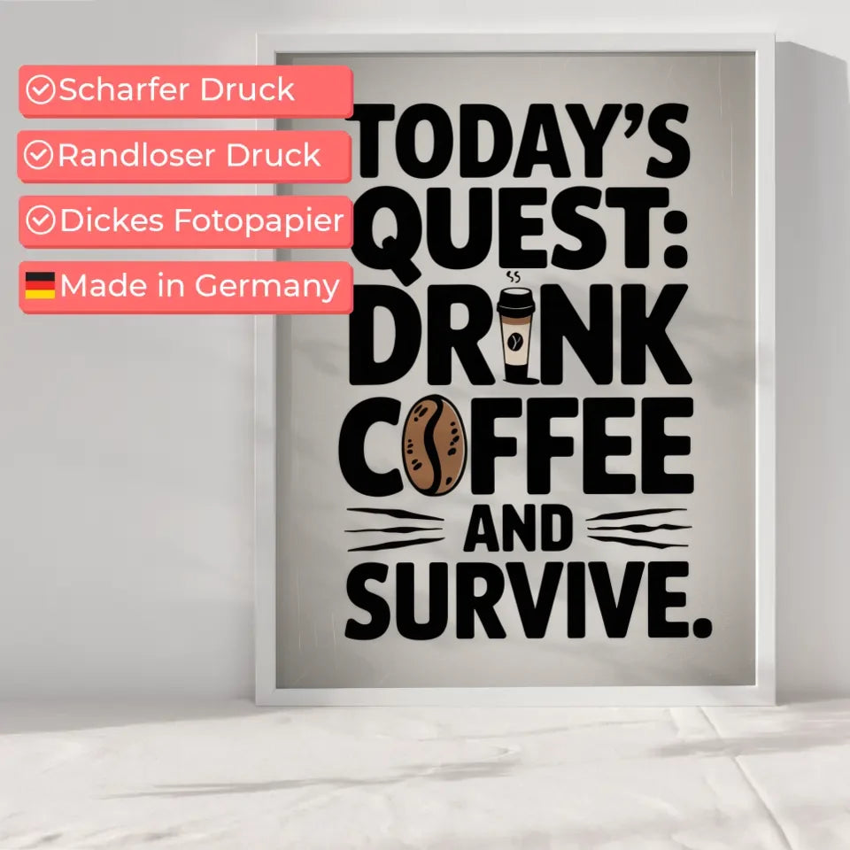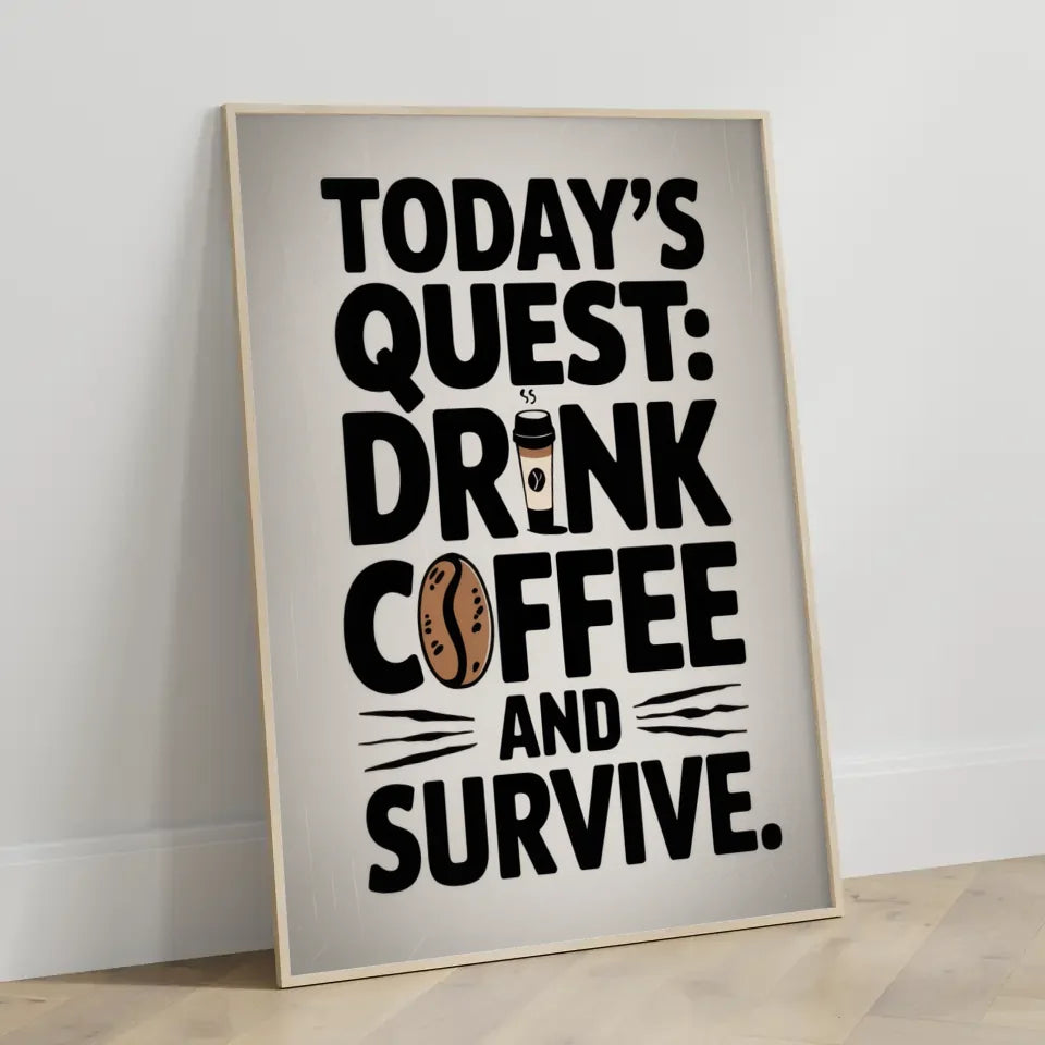 Entdecken Sie unser skurriles und humorvolles Poster mit dem Titel Drink Coffee and Survive, das perfekt für alle Kaffee-Liebhaber und Motivationssuchenden ist. Dieses einzigartige Poster vereint eine witzige Botschaft mit einem ansprechenden Design, das jedem Raum eine fröhliche Note verleiht. Der fettgedruckte Text oben, Today's Quest: Drink Coffee and Survive, zieht sofort die Aufmerksamkeit auf sich und vermittelt eine lustige, aber auch nachvollziehbare Perspektive auf den Alltag. Mit verspielter Typografie und lebendigen Farben hebt sich dieses Poster deutlich ab und sorgt für ein Lächeln bei jedem Betrachter. Die Mischung aus kräftigen und subtilen Elemente sorgt für ein harmonisches visuelles Erlebnis, das die Lust auf eine Tasse Kaffee weckt. Greifen Sie nach diesem humorvollen Poster, um Ihre Wände aufzupeppen und eine motivierende Atmosphäre zu schaffen. Ideal für die Küche, das Büro oder als Geschenk für Freunde, die ebenfalls die Freude am Kaffee schätzen. Holen Sie sich jetzt Ihr eigenes humorvolles Poster und machen Sie jeden Tag zu einem neuen Abenteuer mit einer Tasse Kaffee!
