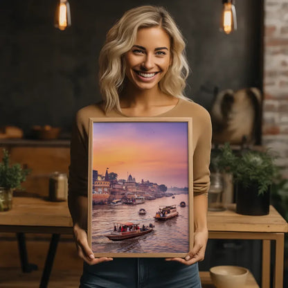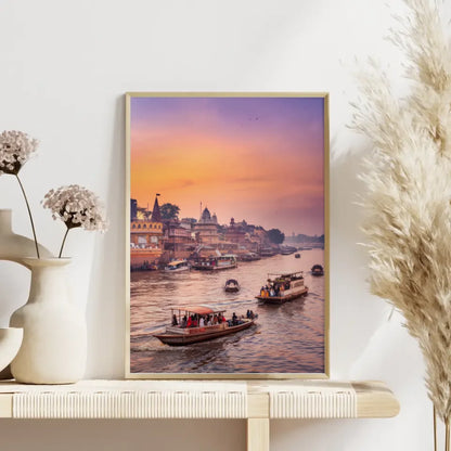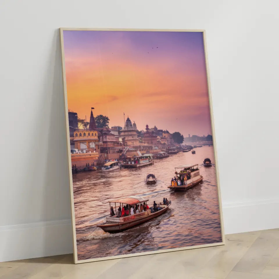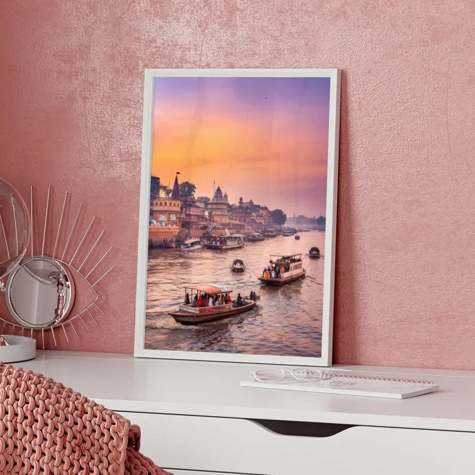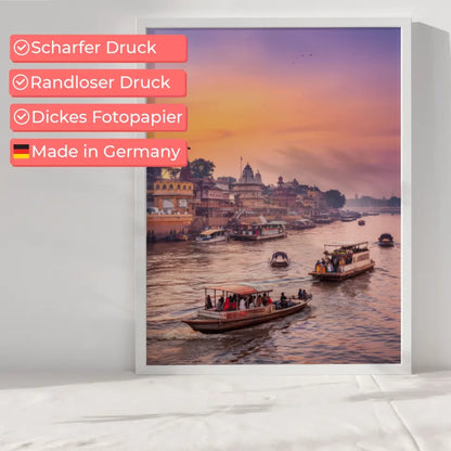 Gestalten Sie Ihr Zuhause individuell und kreativ mit unserem Poster Varanasi Indien. Bestellen Sie jetzt und lassen Sie sich von der Magie der Goldenen Stunde verzaubern!