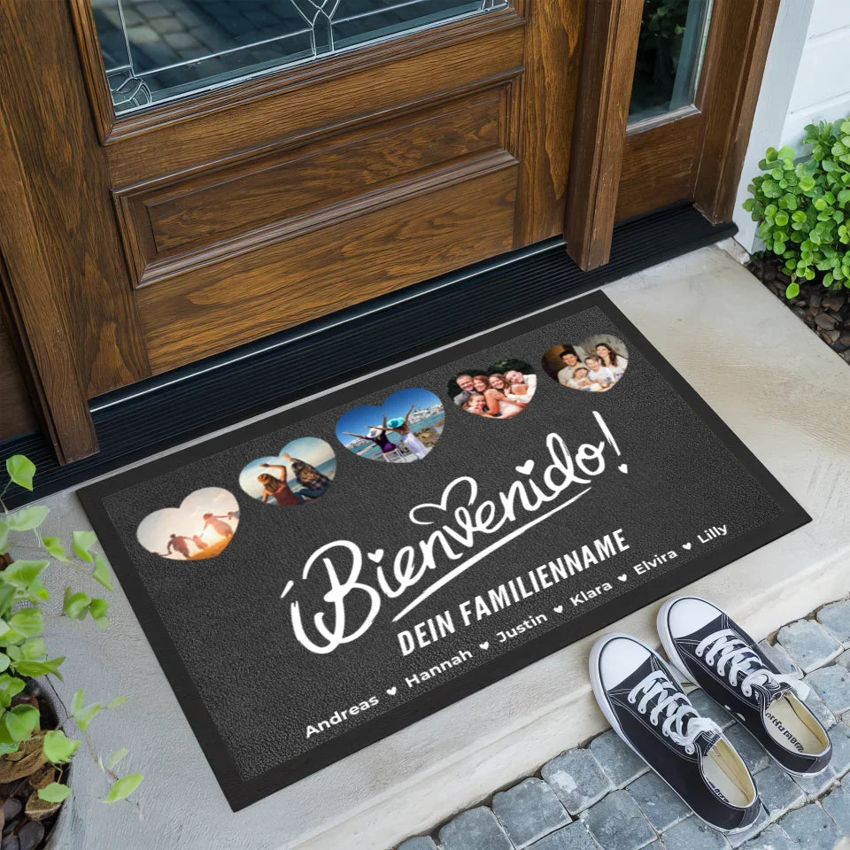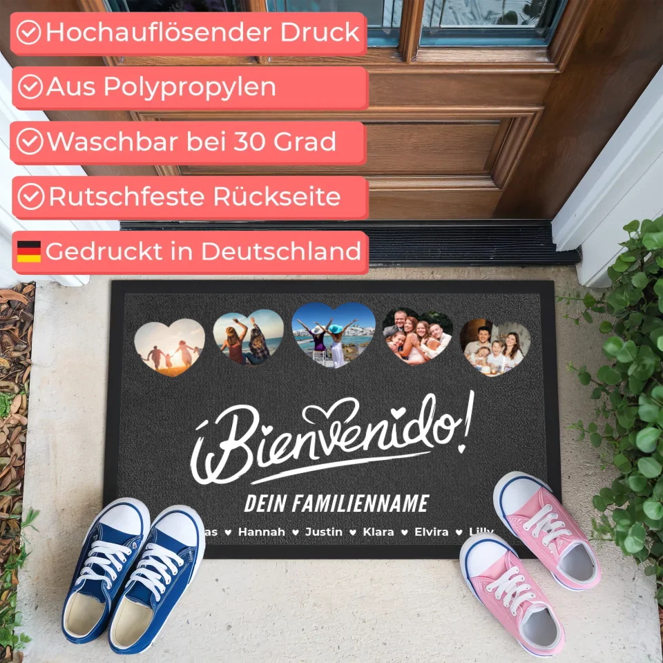 Überrasche deine Gäste mit einer stilvollen und zugleich praktischen Fußabtreter-Lösung, die nicht nur schick aussieht, sondern auch Funktionalität bietet. Diese Fußmatte wird sicherlich zu einem Blickfang im Eingangsbereich und sorgt für den perfekten Empfang deiner Gäste. Verwandle deinen Eingangsbereich in einen einladenden Raum mit unserer individuellen Fußmatte Familie Willkommen auf Spanisch ¡Bienvenido! und bringe gleichzeitig einen Hauch von Persönlichkeit in dein Zuhause!