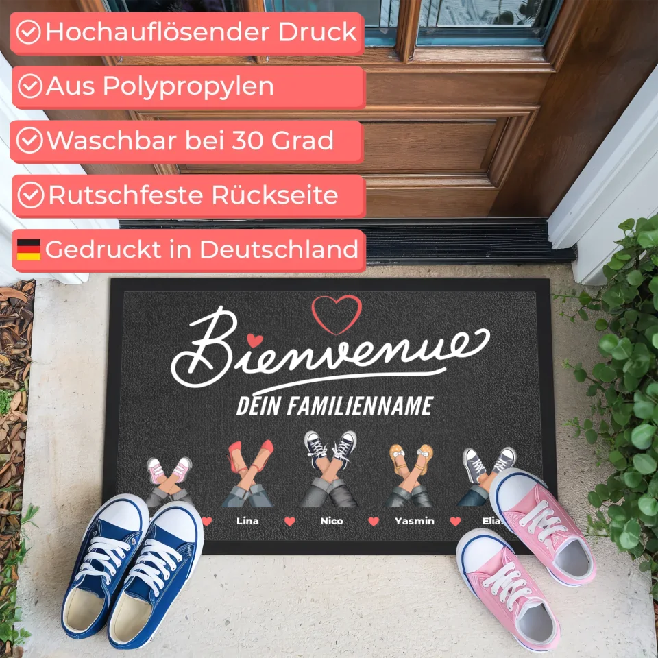 Du kannst die Fußmatte personalisieren, indem du Bilder von euren Schuhen – egal ob Sneakers, High Heels oder Boots – hinzufügst. Ergänze die individuelle Fußmatte mit deinem Namen, einem eigenen Spruch oder Wunschtext sowie dem Familiennamen. So wird jeder Besuch zu einem besonderen Erlebnis und jeder Schritt auf deiner Matte ist ein Zeichen für persönliche Note.